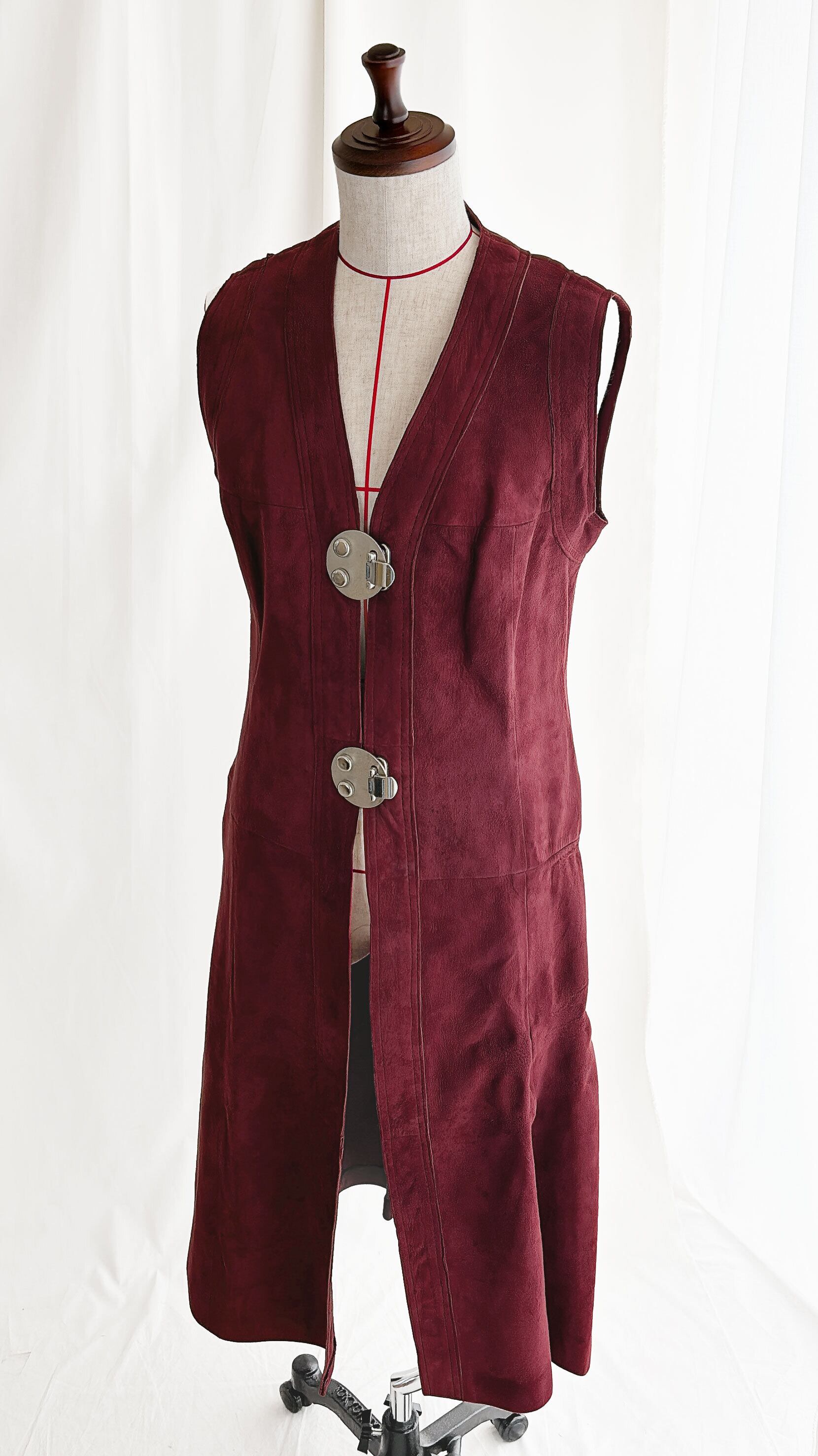 深いワインレッドのレザーに、重厚なメタルボタンが静かに輝くロングジレ。