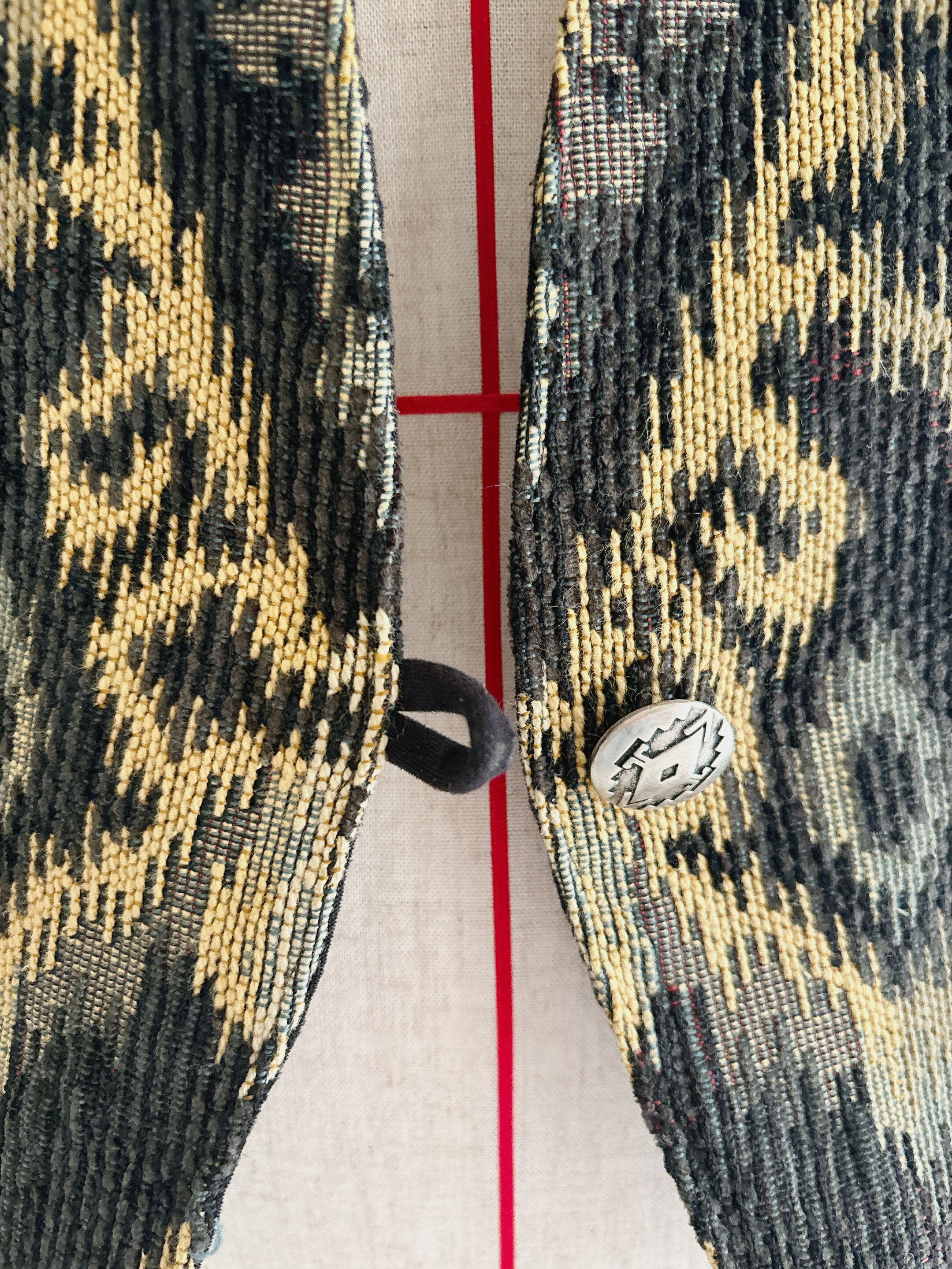 ネイティブ柄を大胆にあしらい、コンチョボタンがアクセントに。