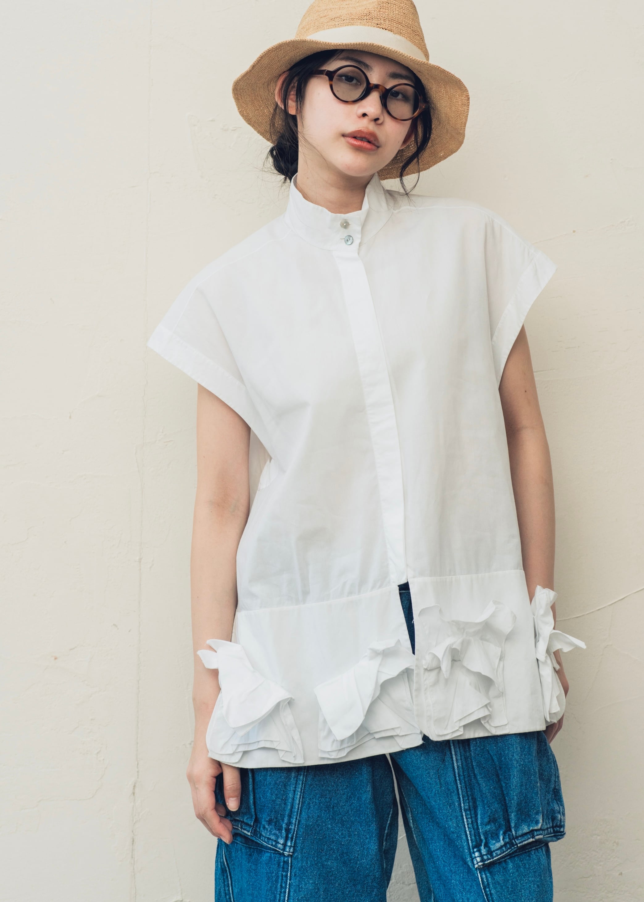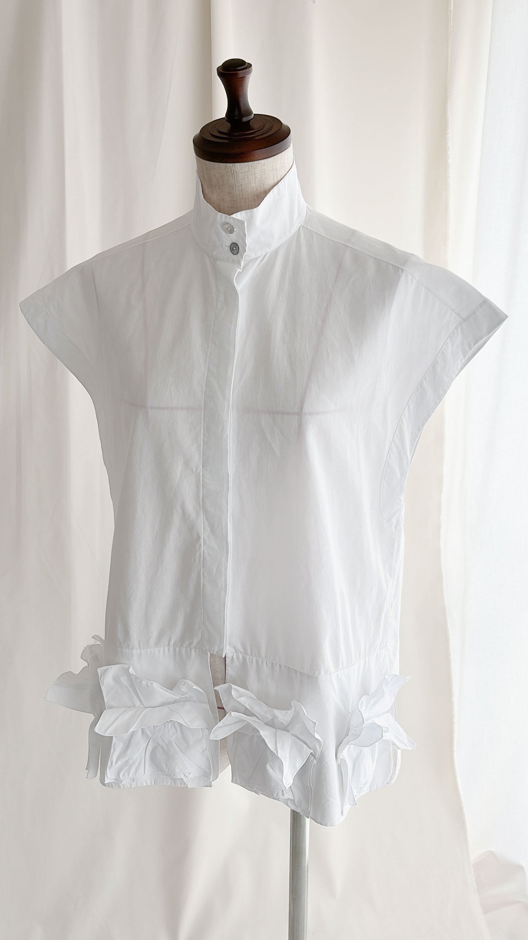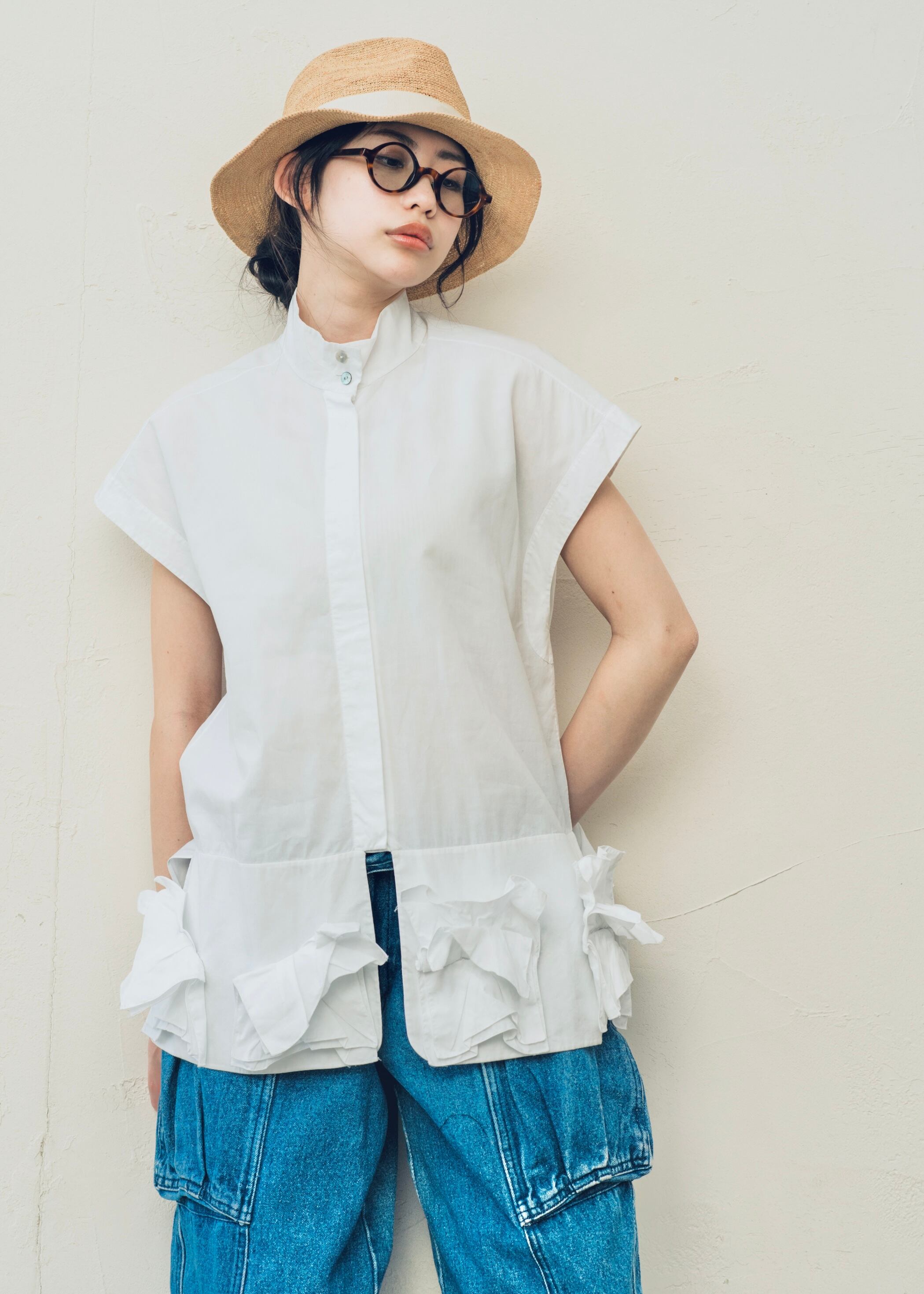 一見シンプルなホワイトのクロップドトップスに立体的な装飾が映え、彫刻のような存在感を放ちます。