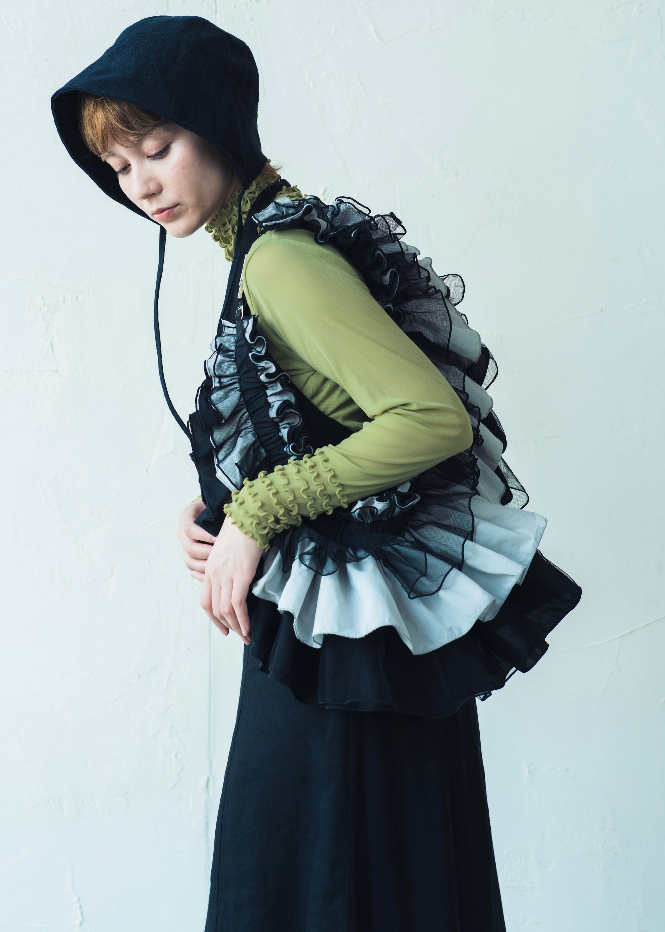 この絶妙な素材の掛け合わせが、フリルをしっかり立たせながらも、さりげなく揺れる動きを演出します。