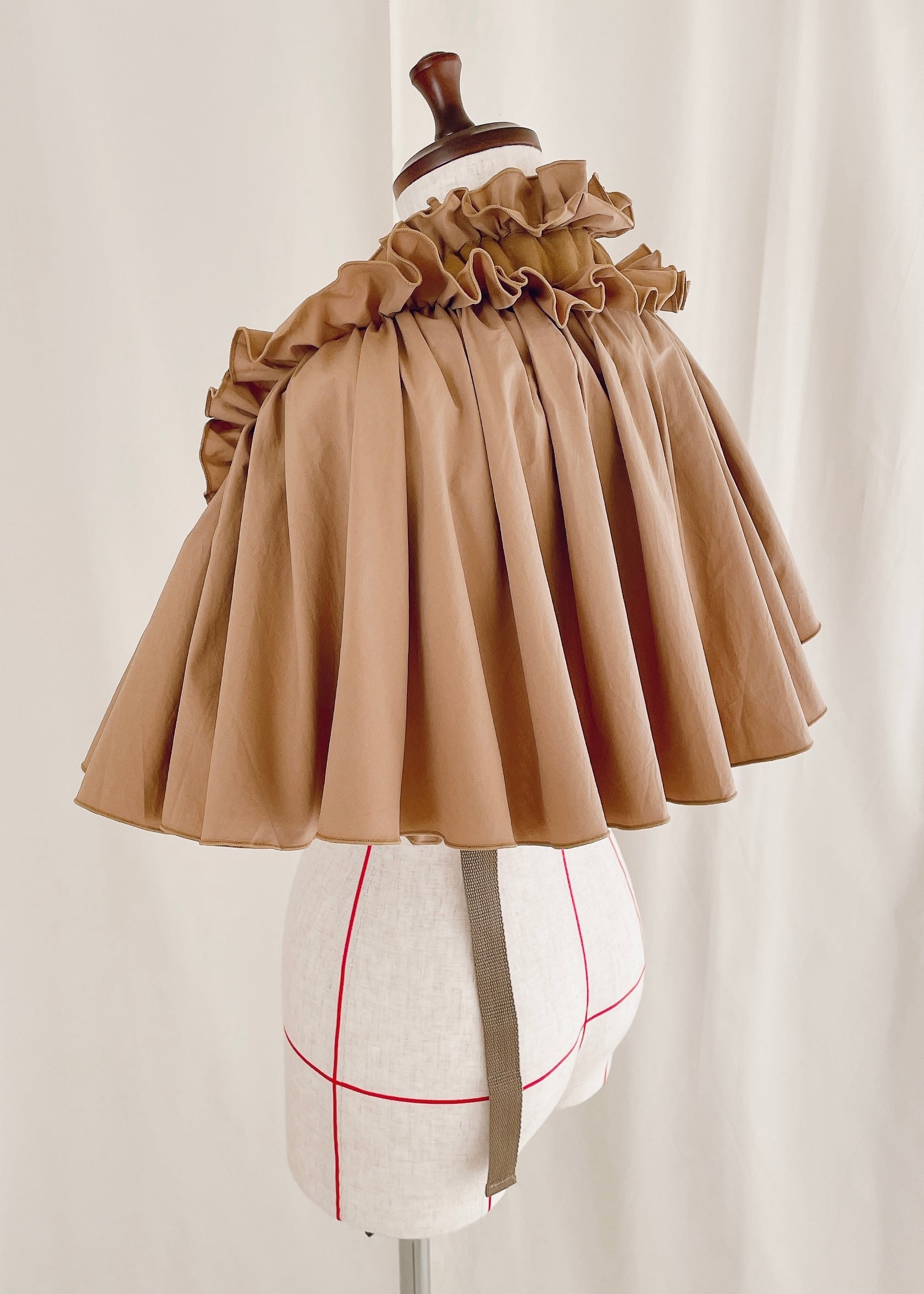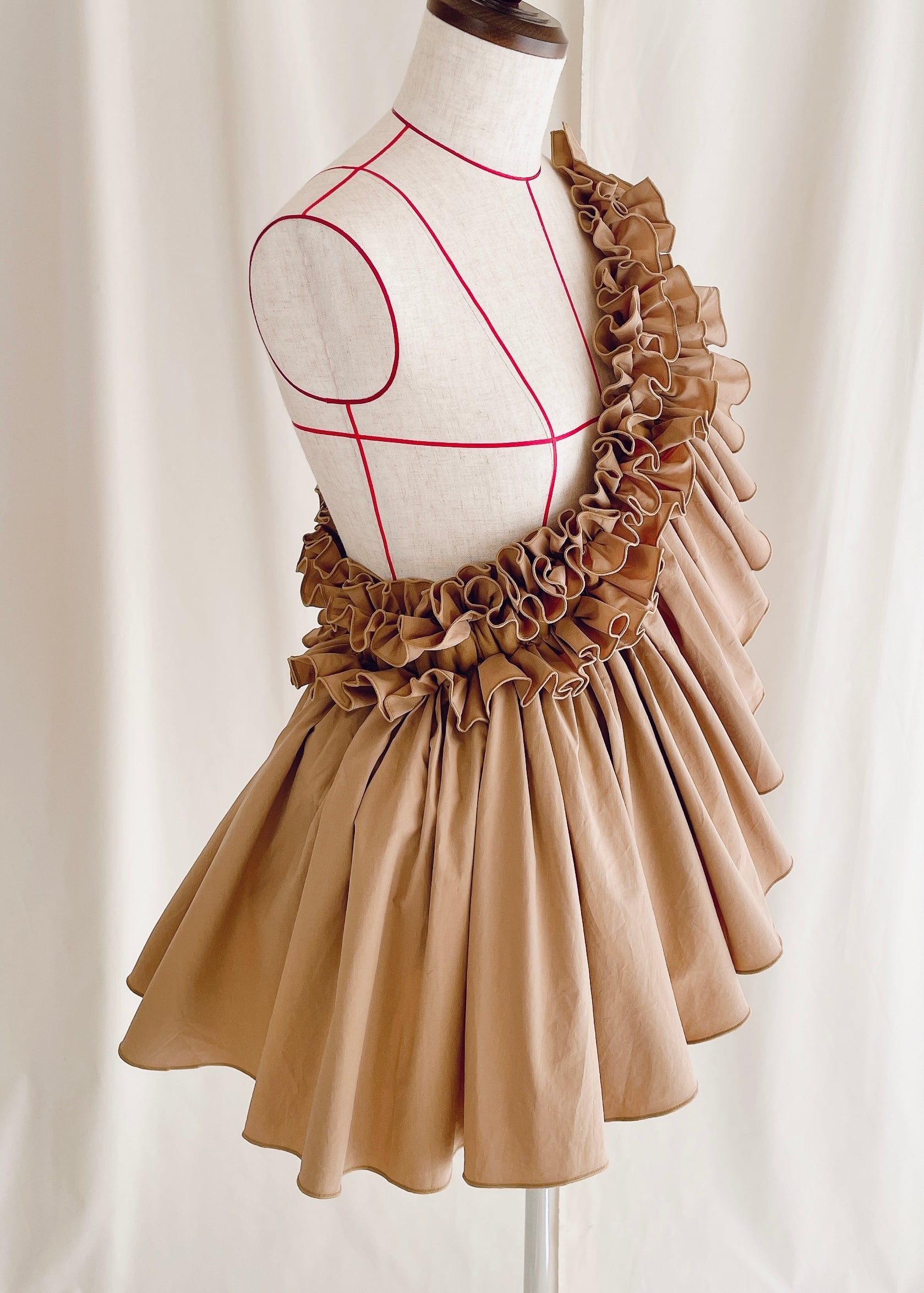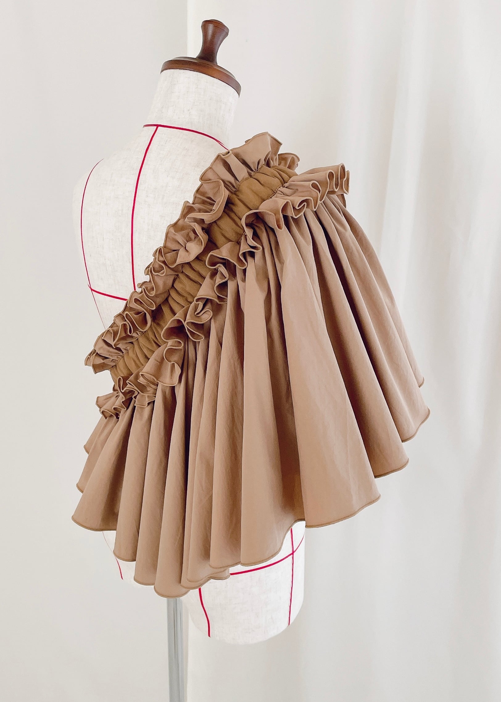 程よいハリとしなやかさを兼ね備えているため、美しいドレープが生まれ、立体的なフリルに。