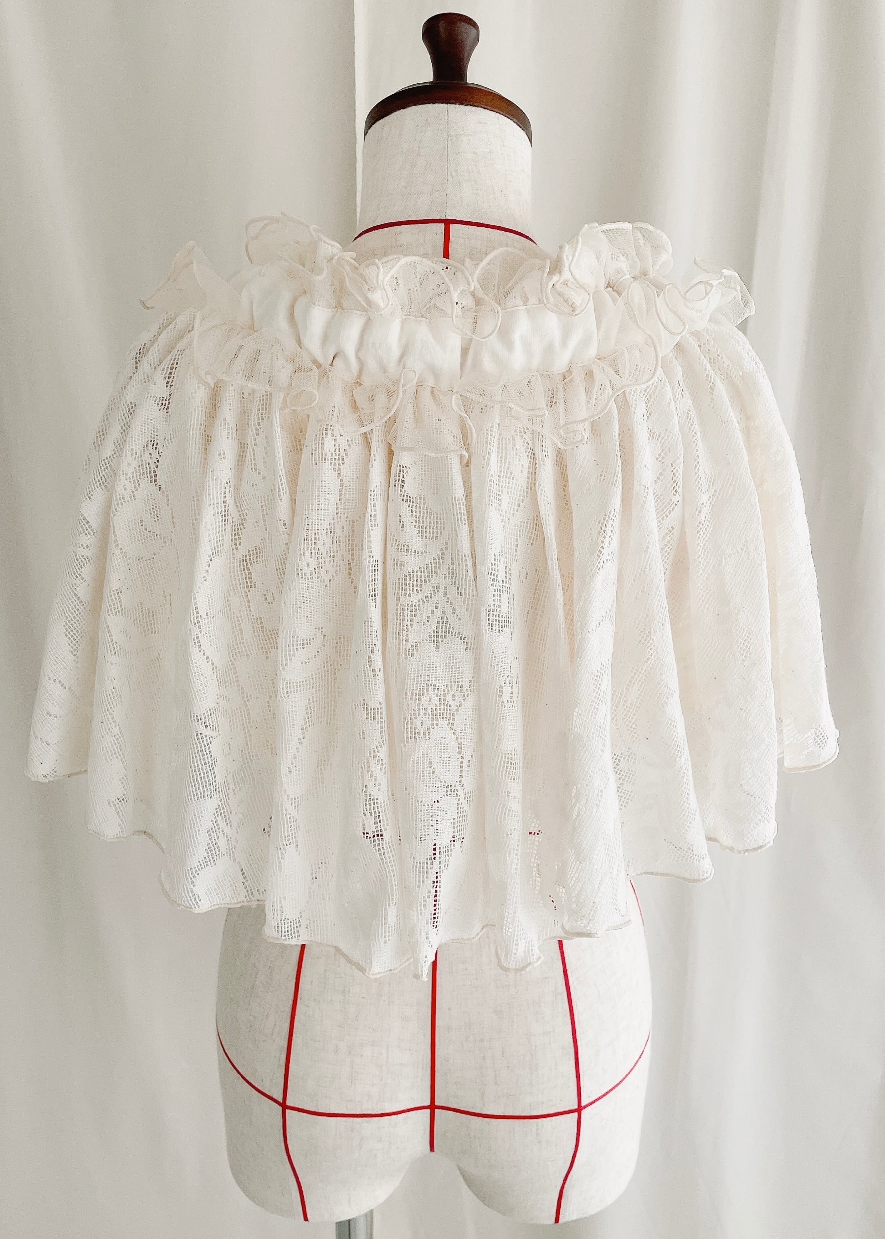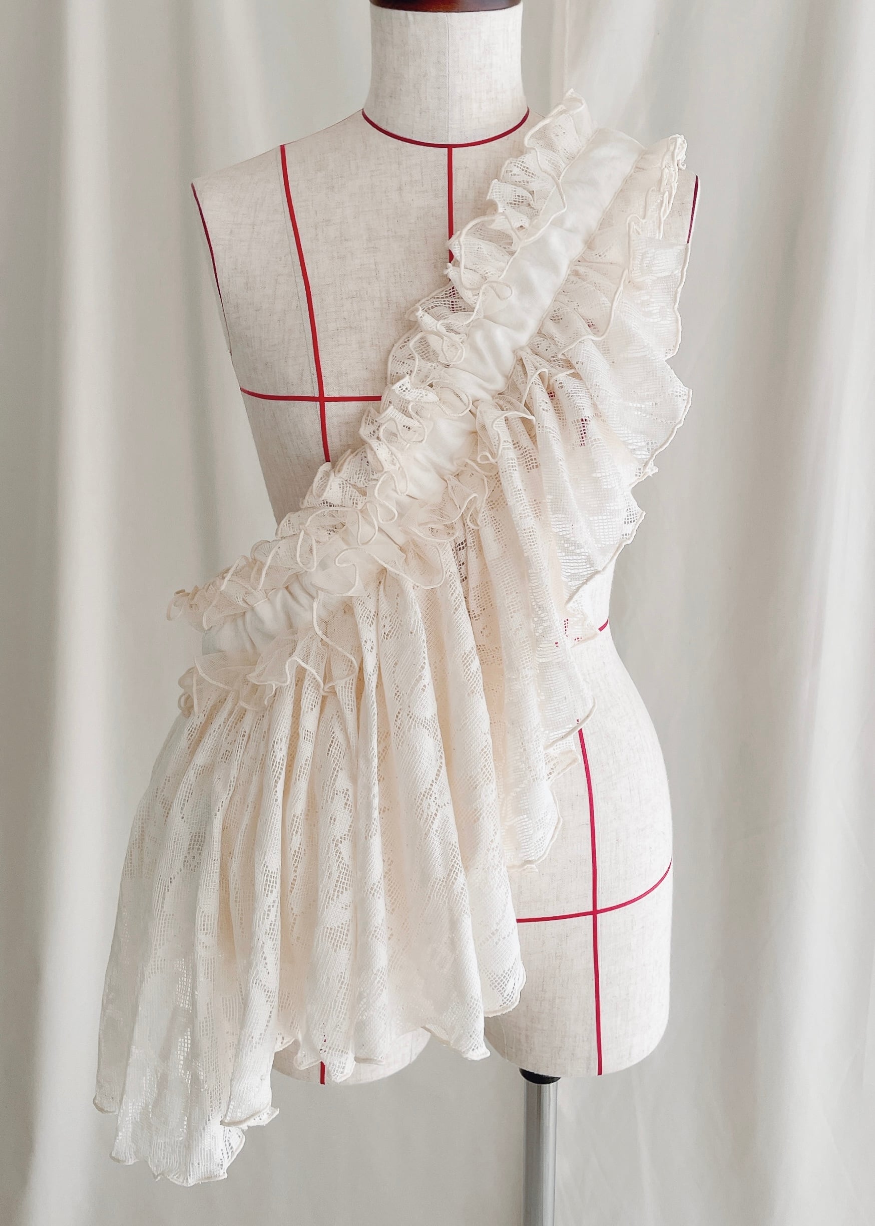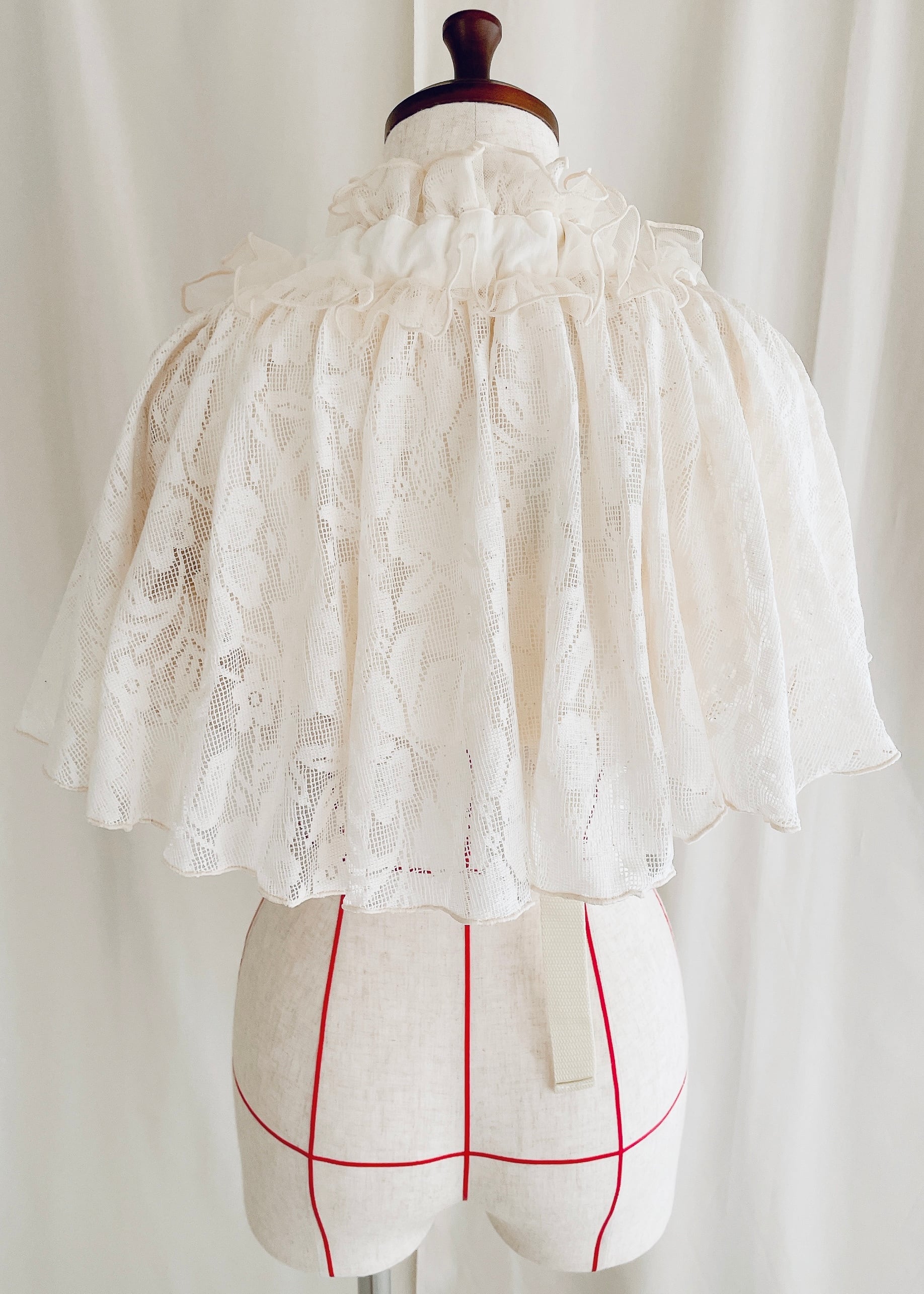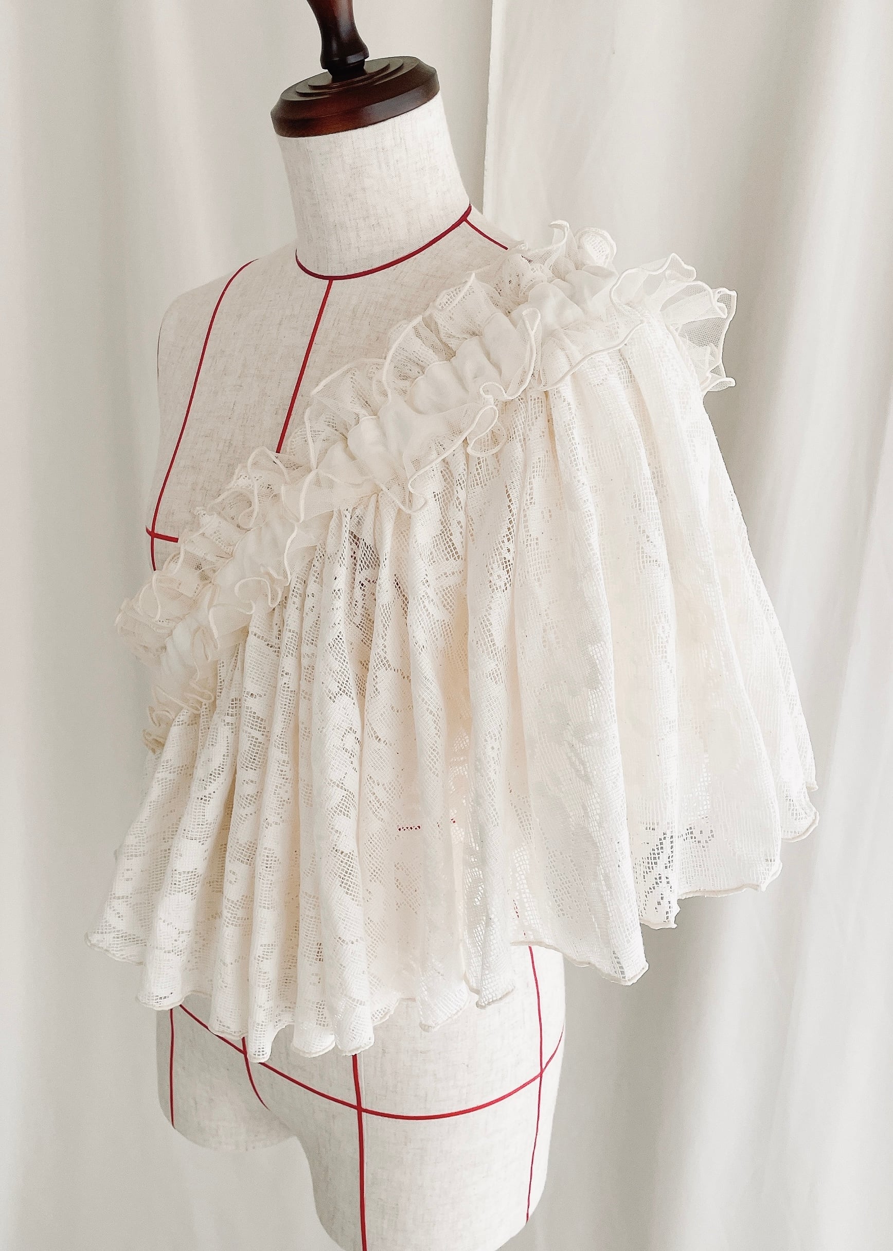 フリル部分にはヴィンテージレースを思わせるようなクラフト感あるクロッシェレースを使用。