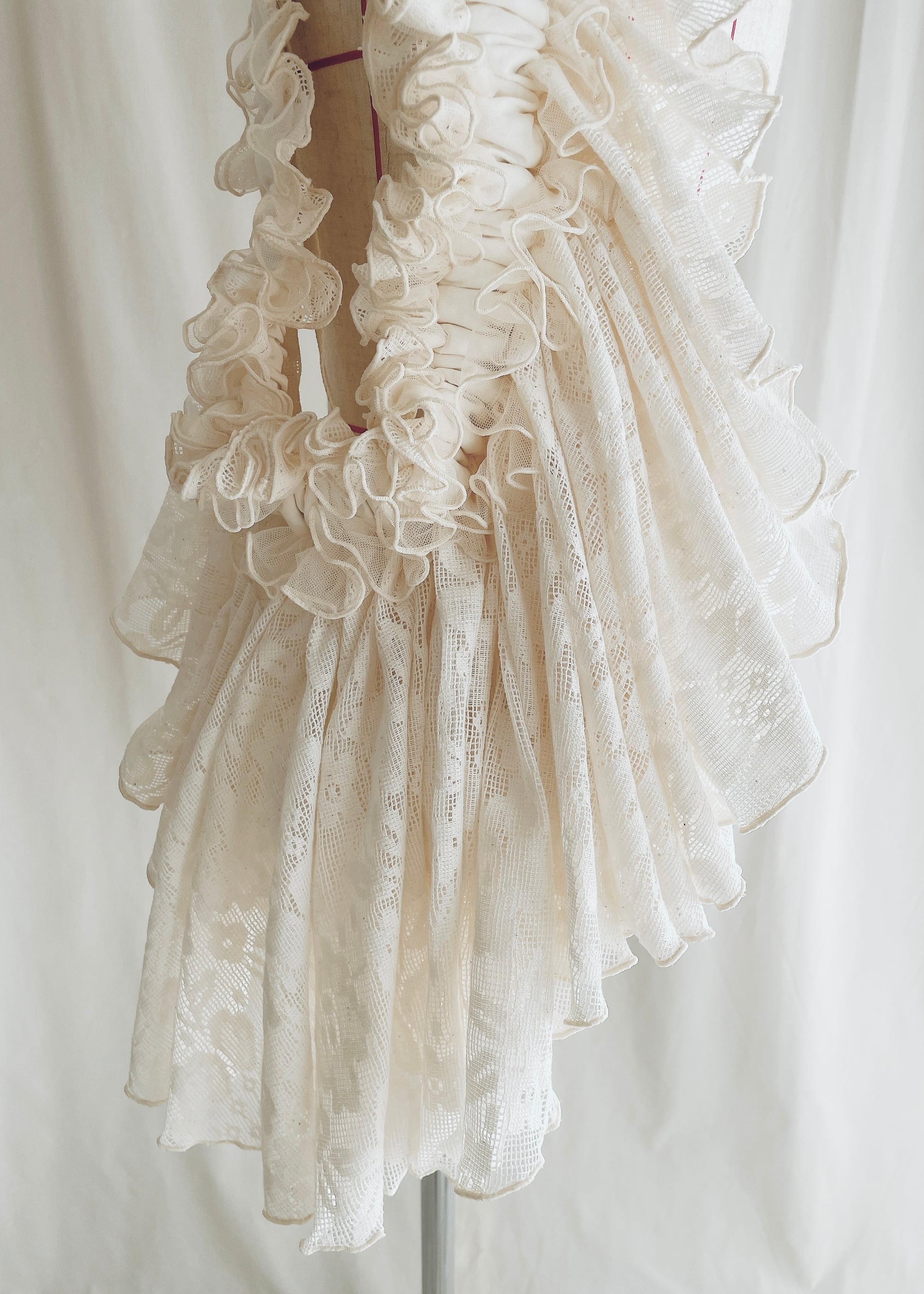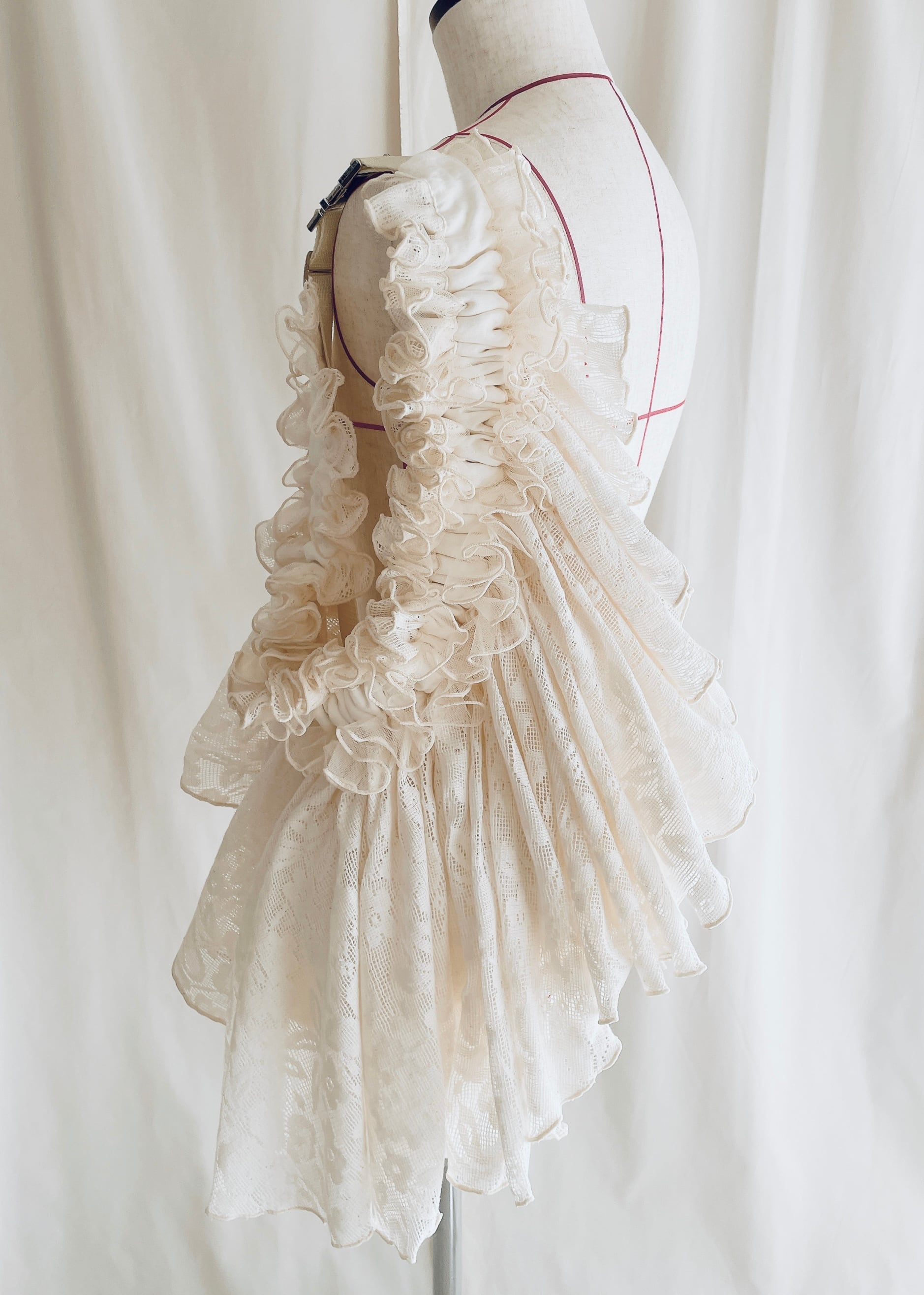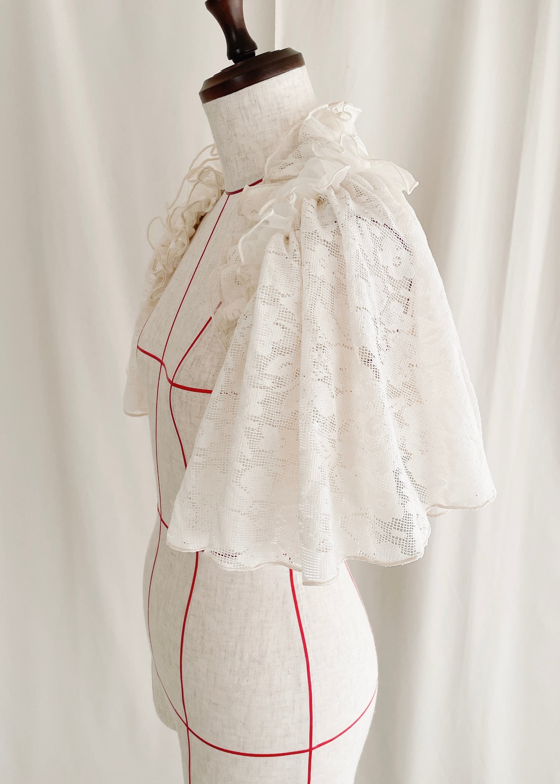 フリル部分にはヴィンテージレースを思わせるようなクラフト感あるクロッシェレースを使用。