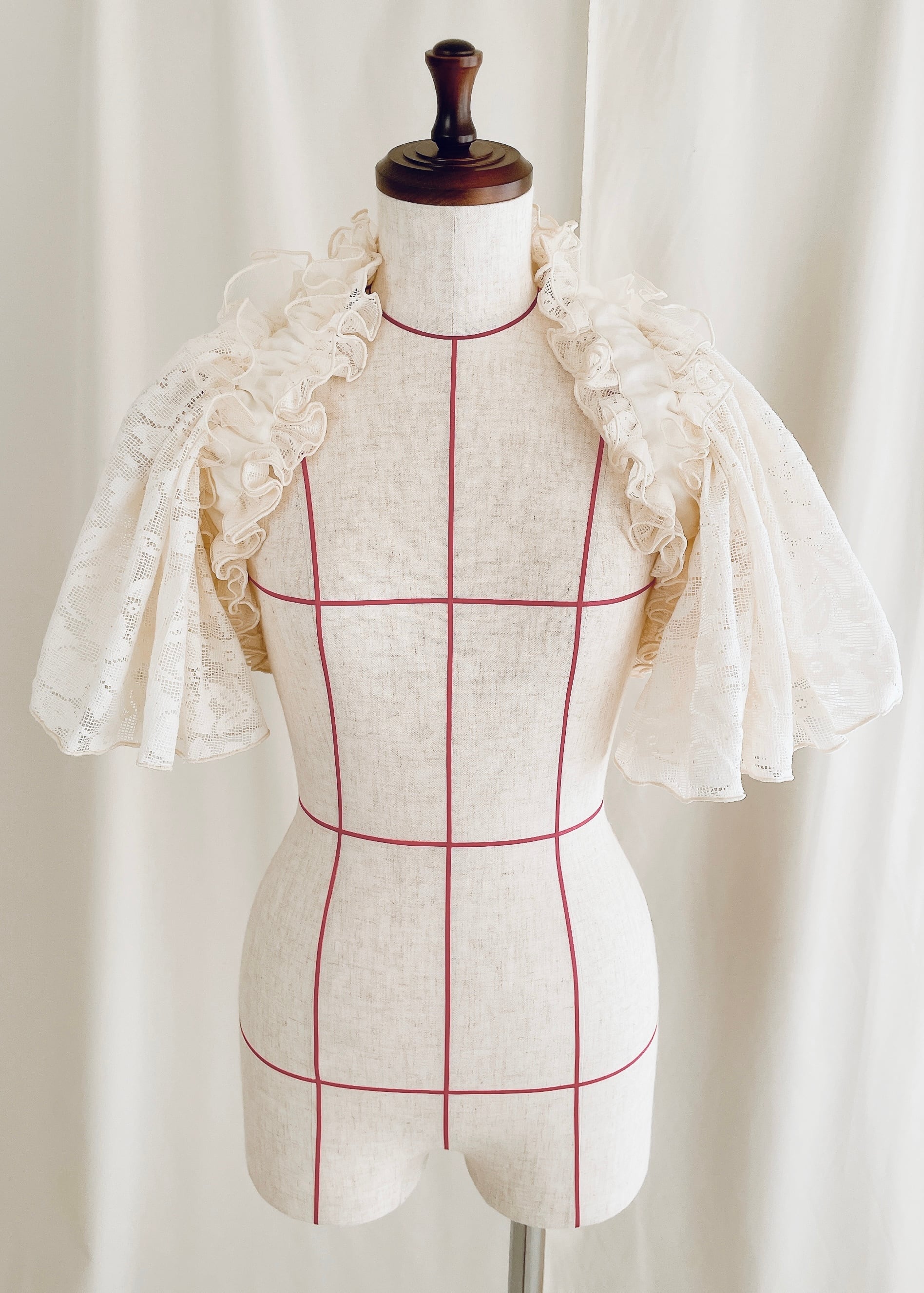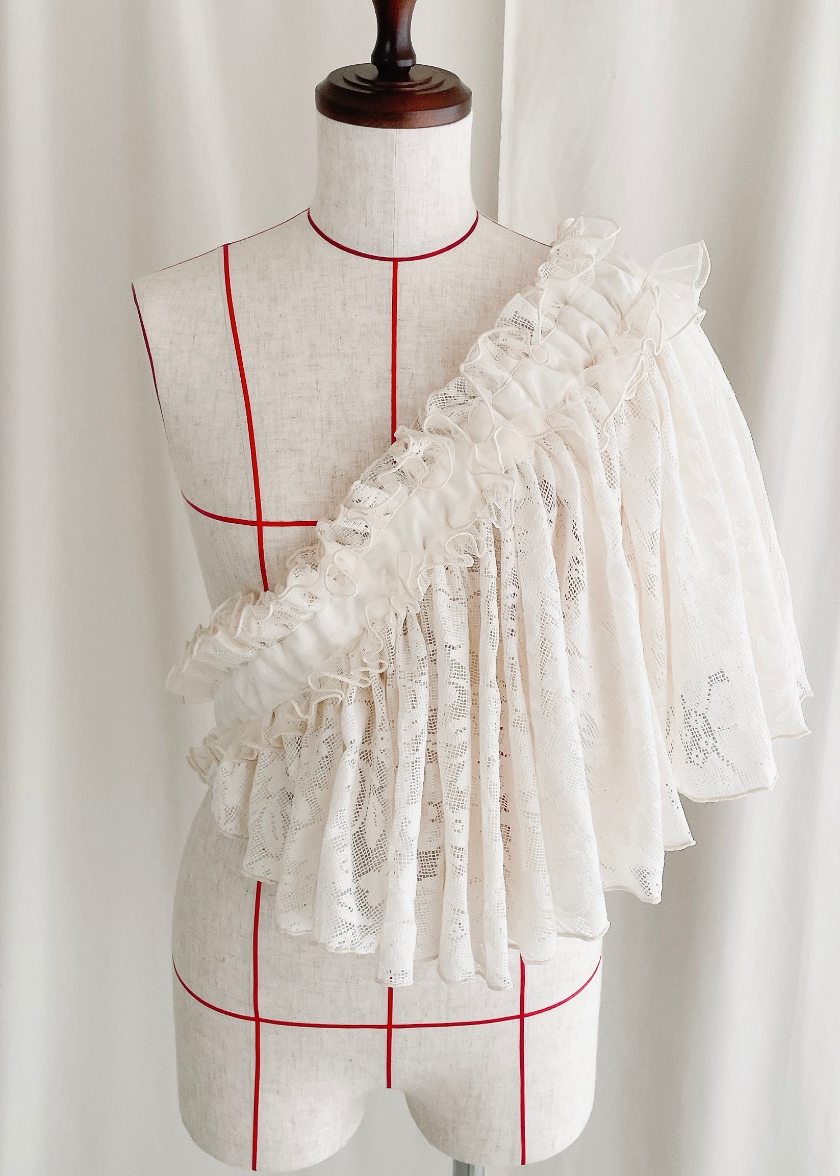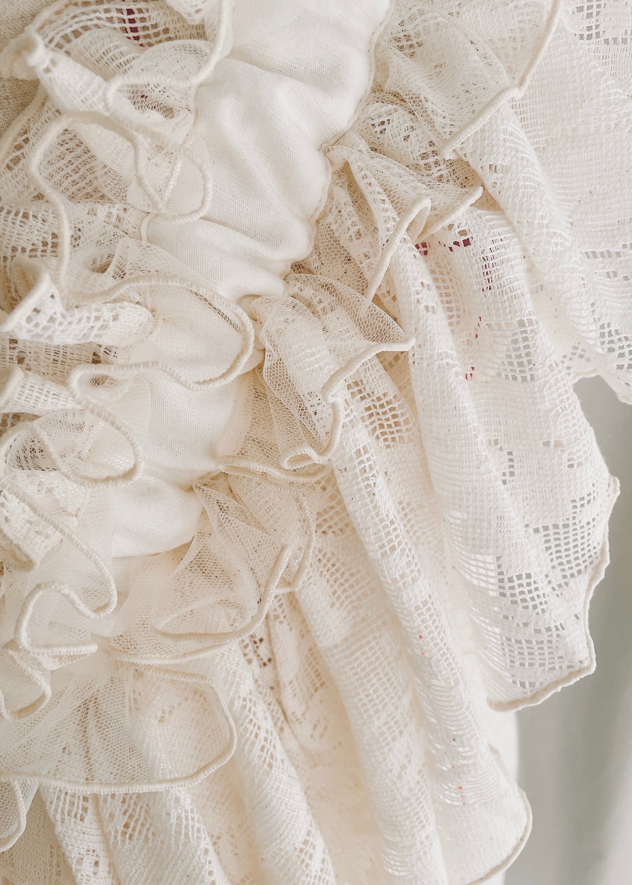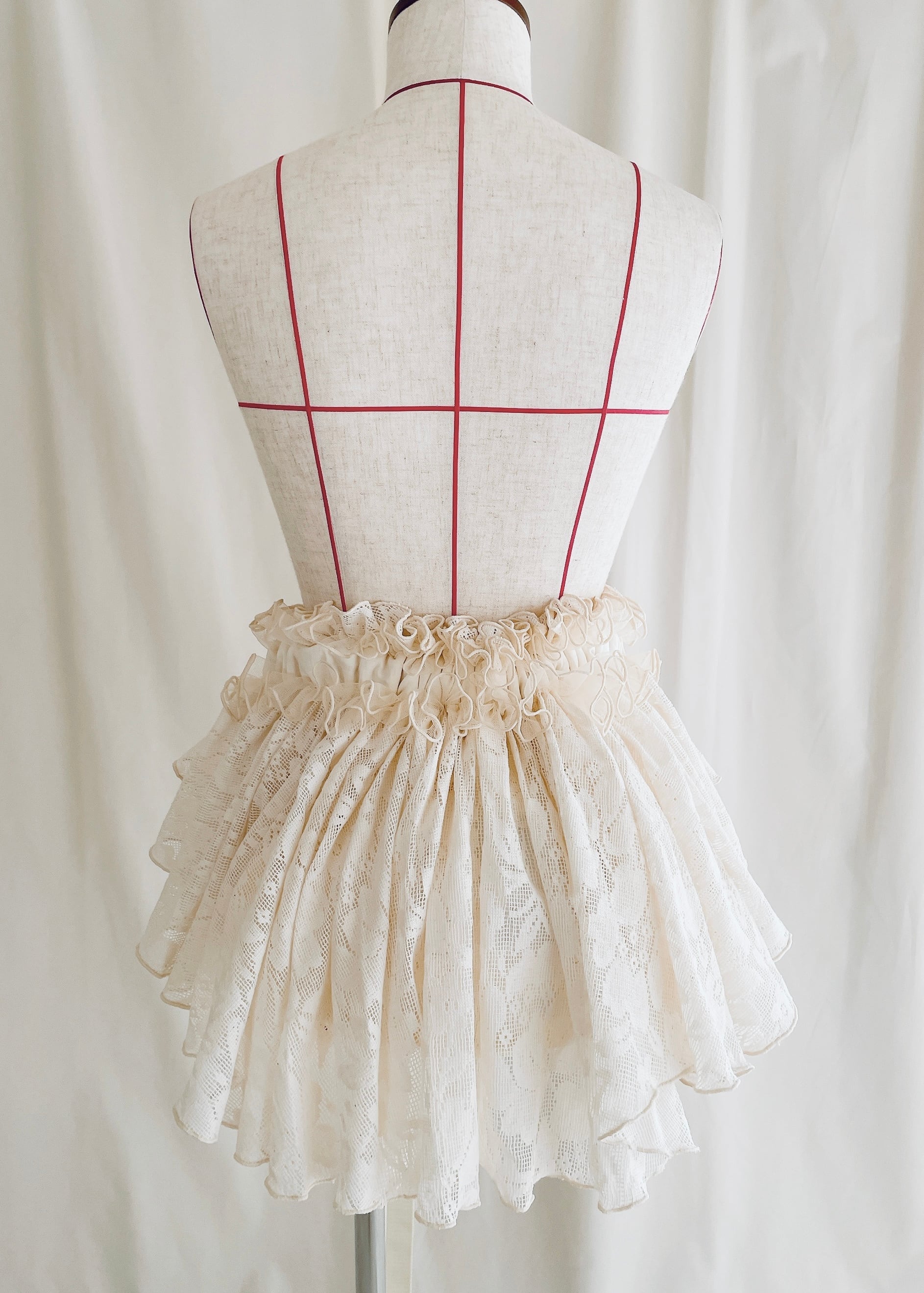フリル部分にはヴィンテージレースを思わせるようなクラフト感あるクロッシェレースを使用。