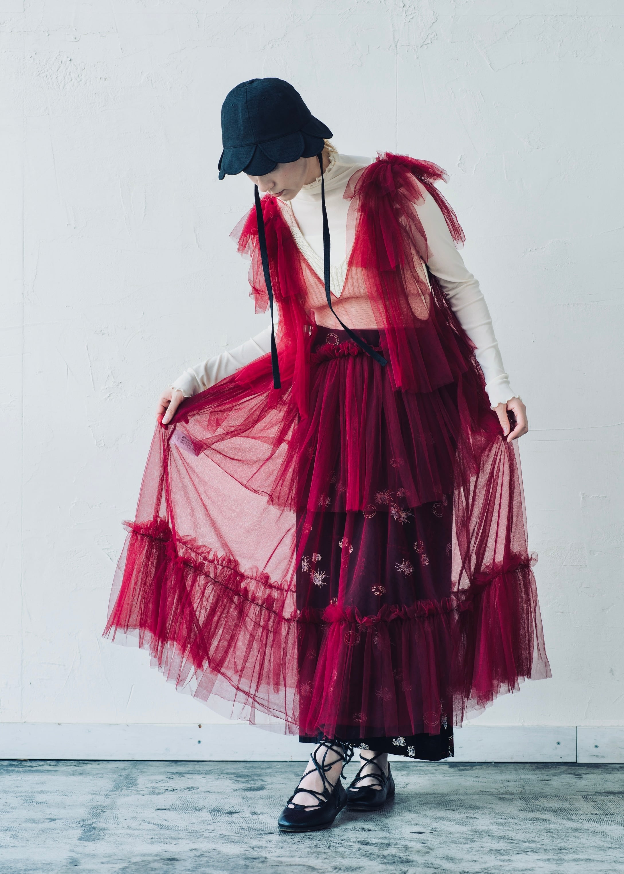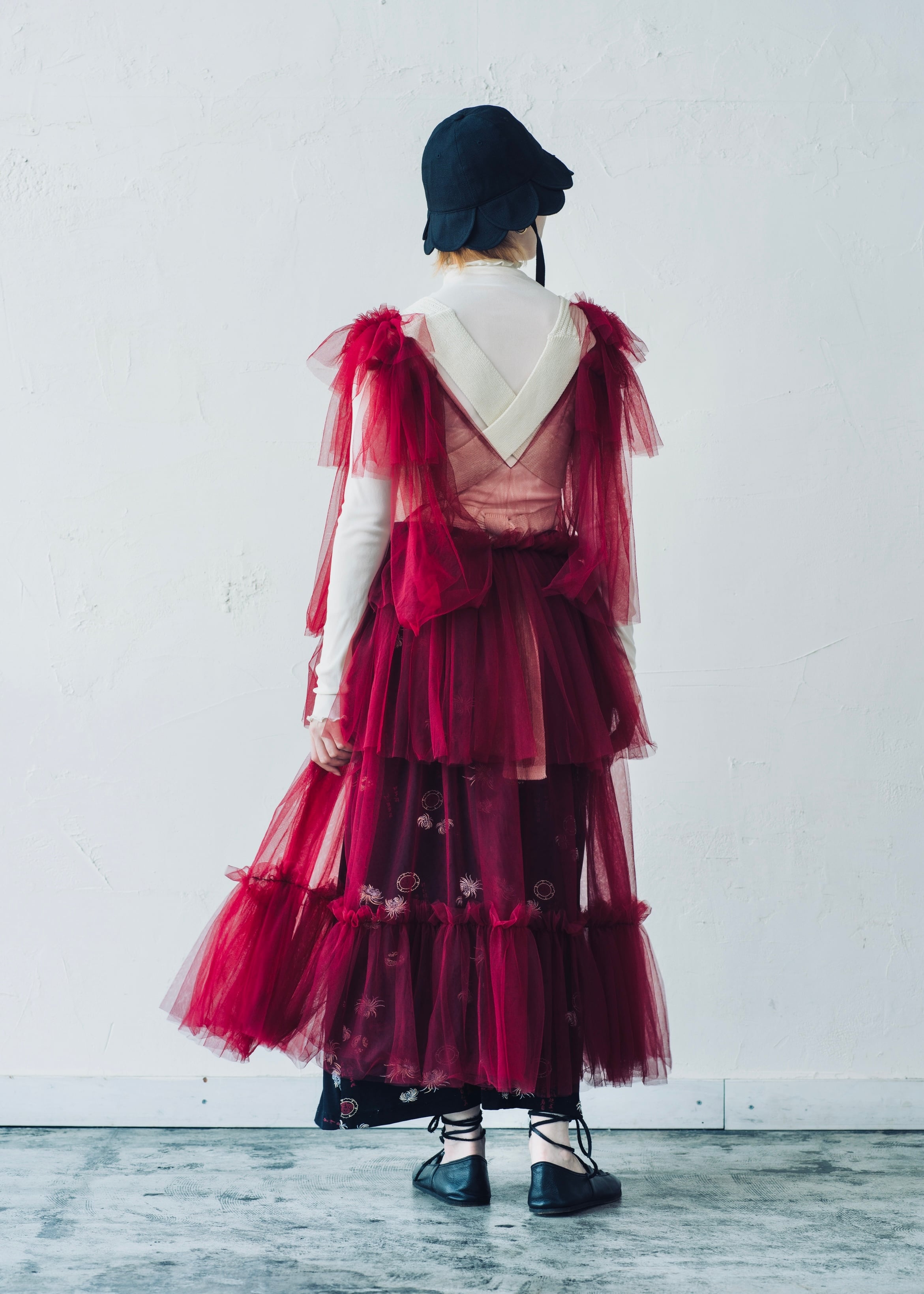 チュールの繊細な透け感とフリルの重なりが見せる濃淡が美しい。