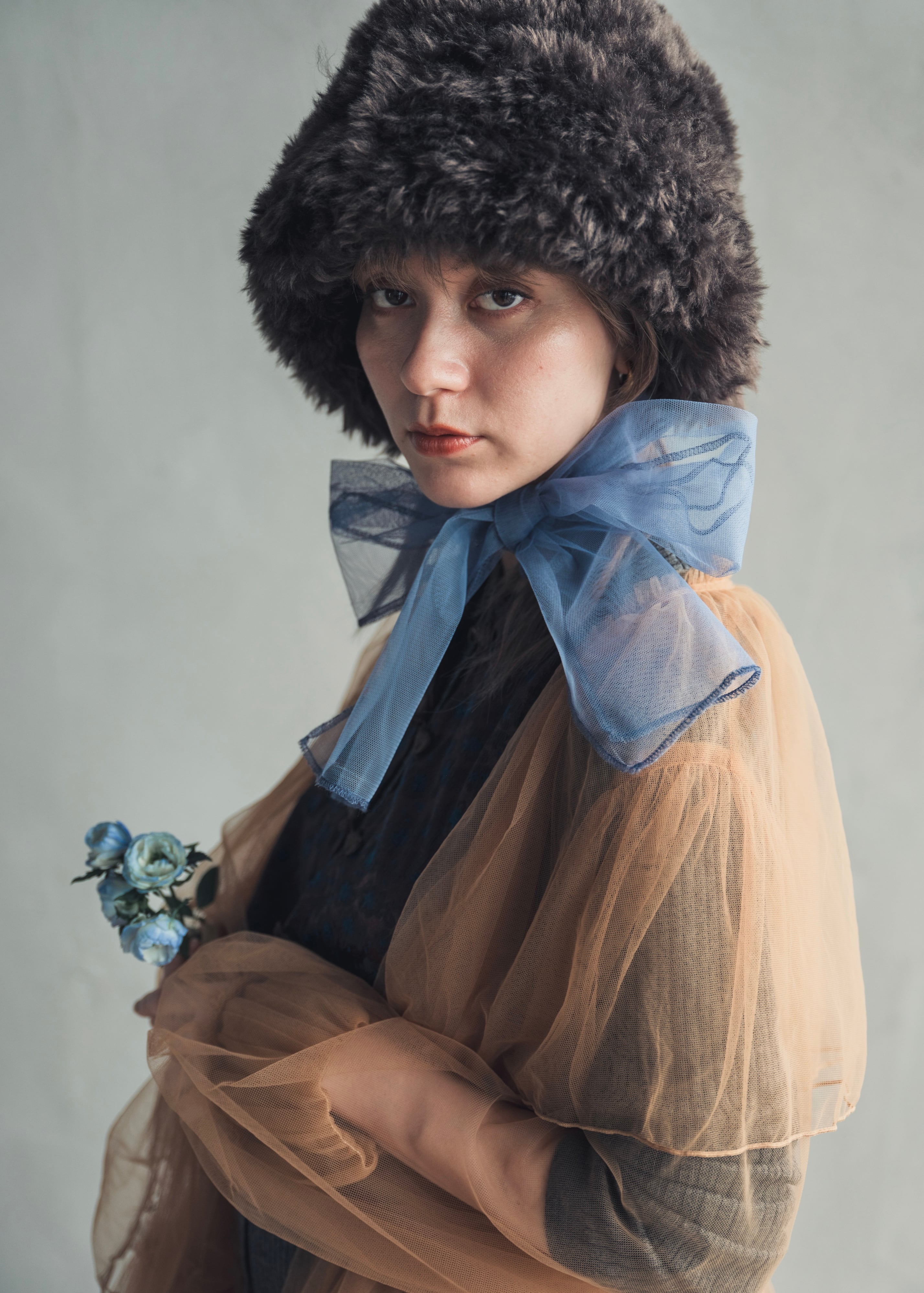 チュールリボンはラフに垂らしても、あご下や後ろで結んでも印象自在。