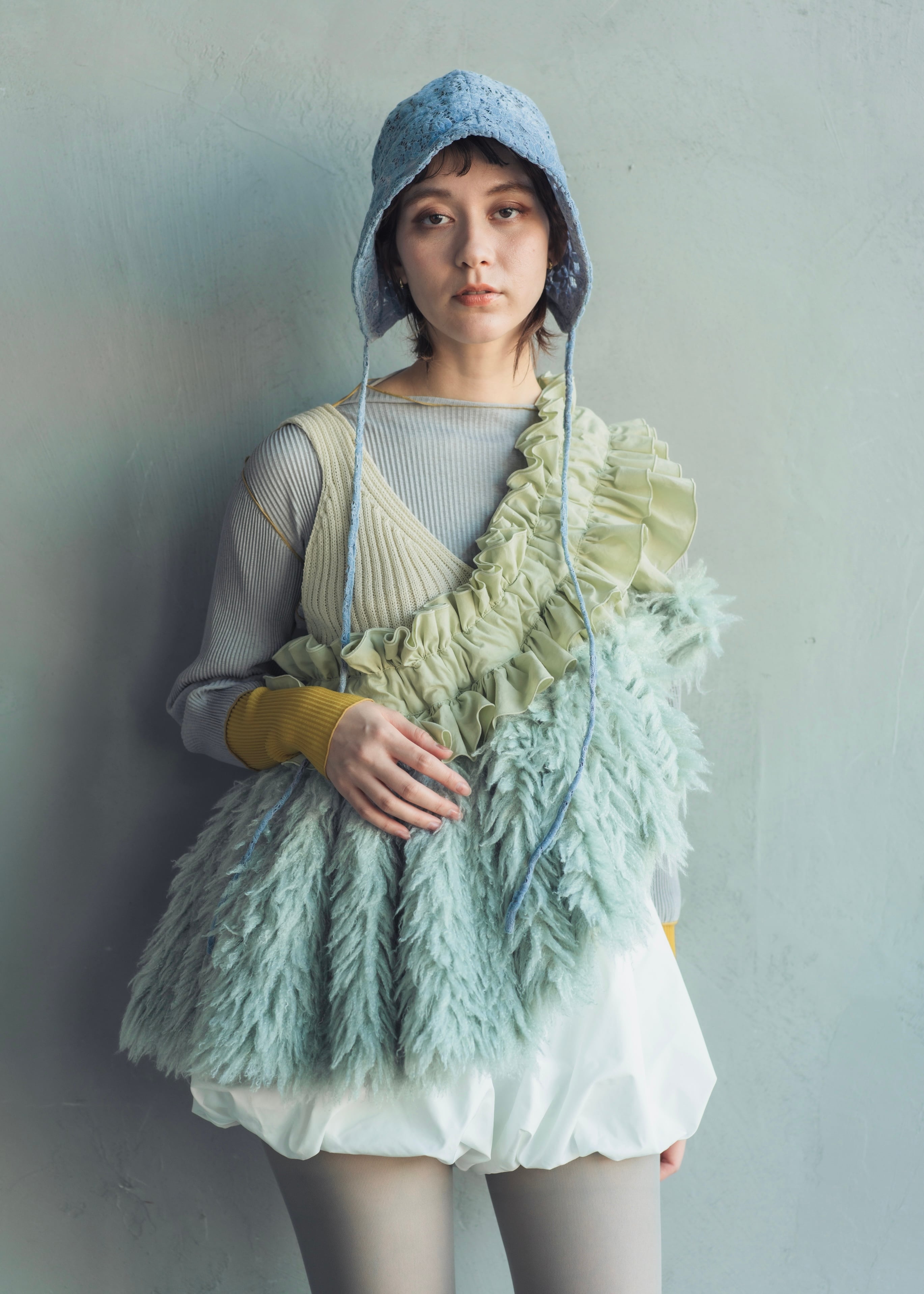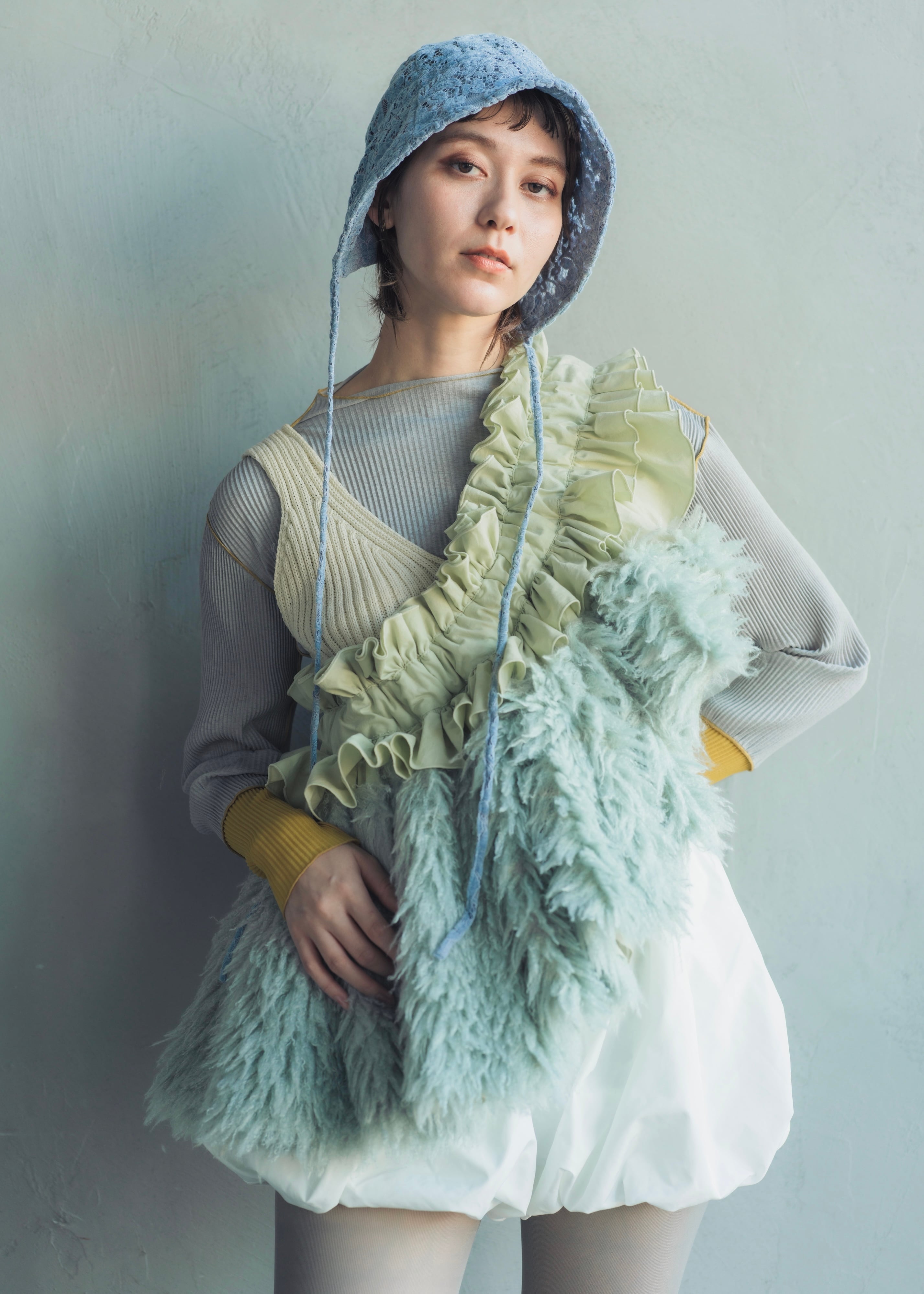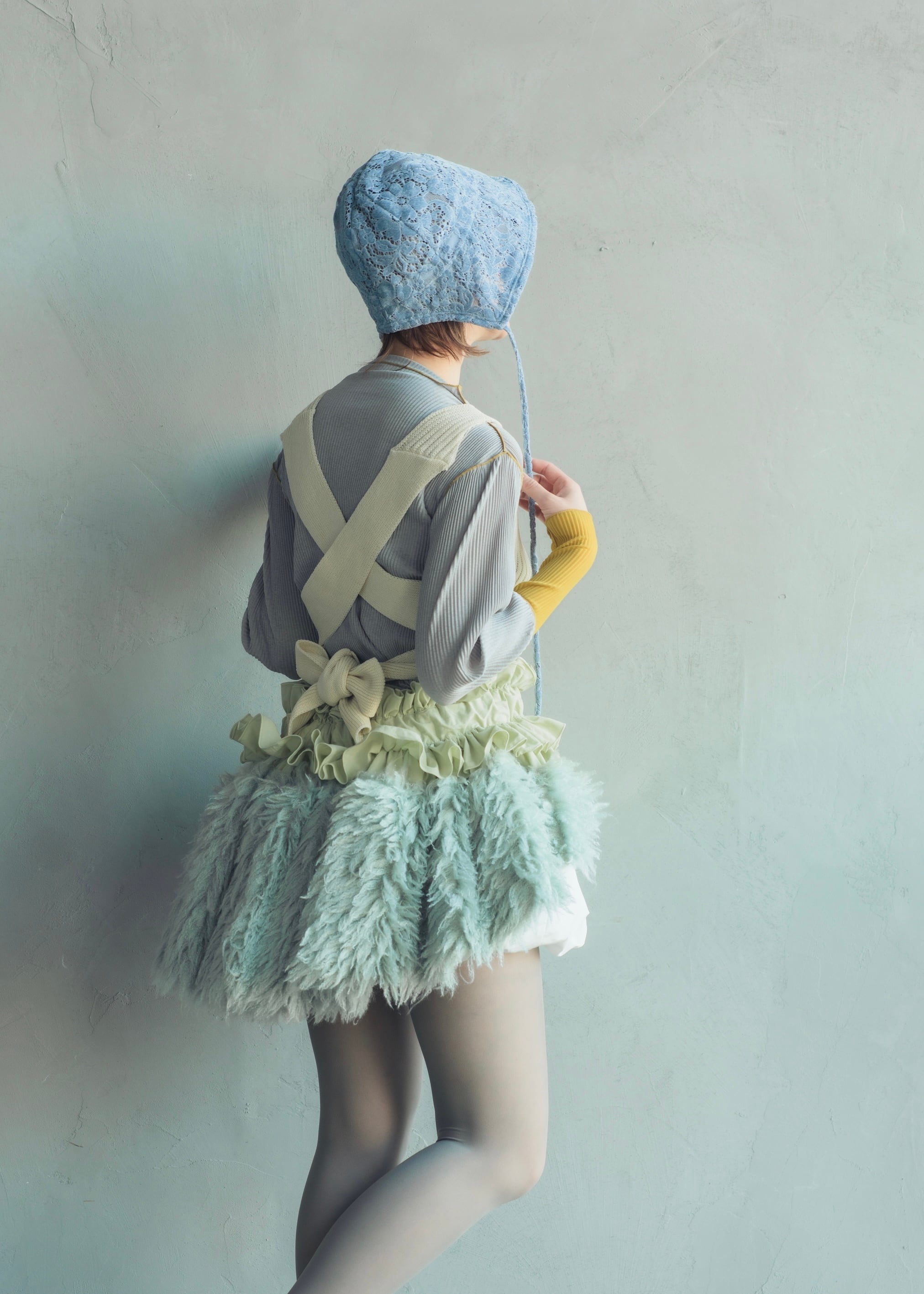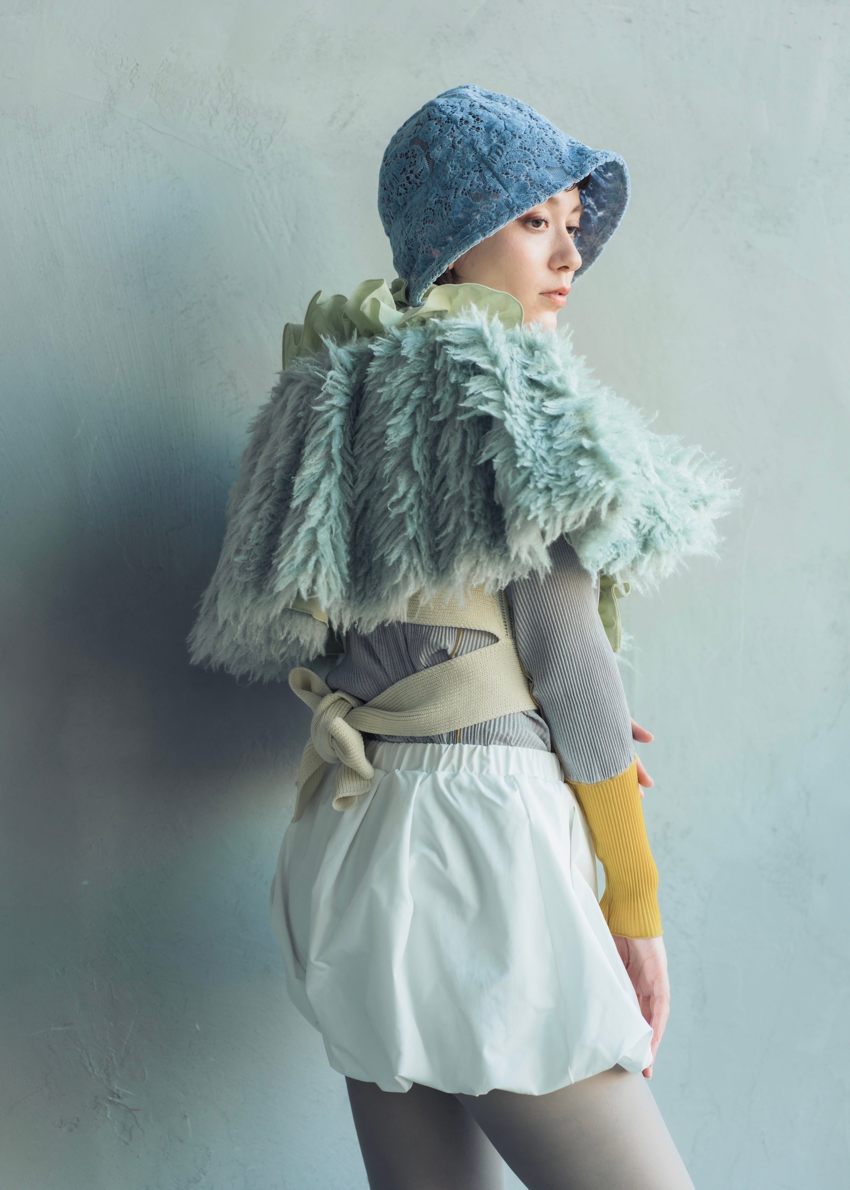 相反する素材が織りなすコントラストがどこか儚くも上品な印象を残します。