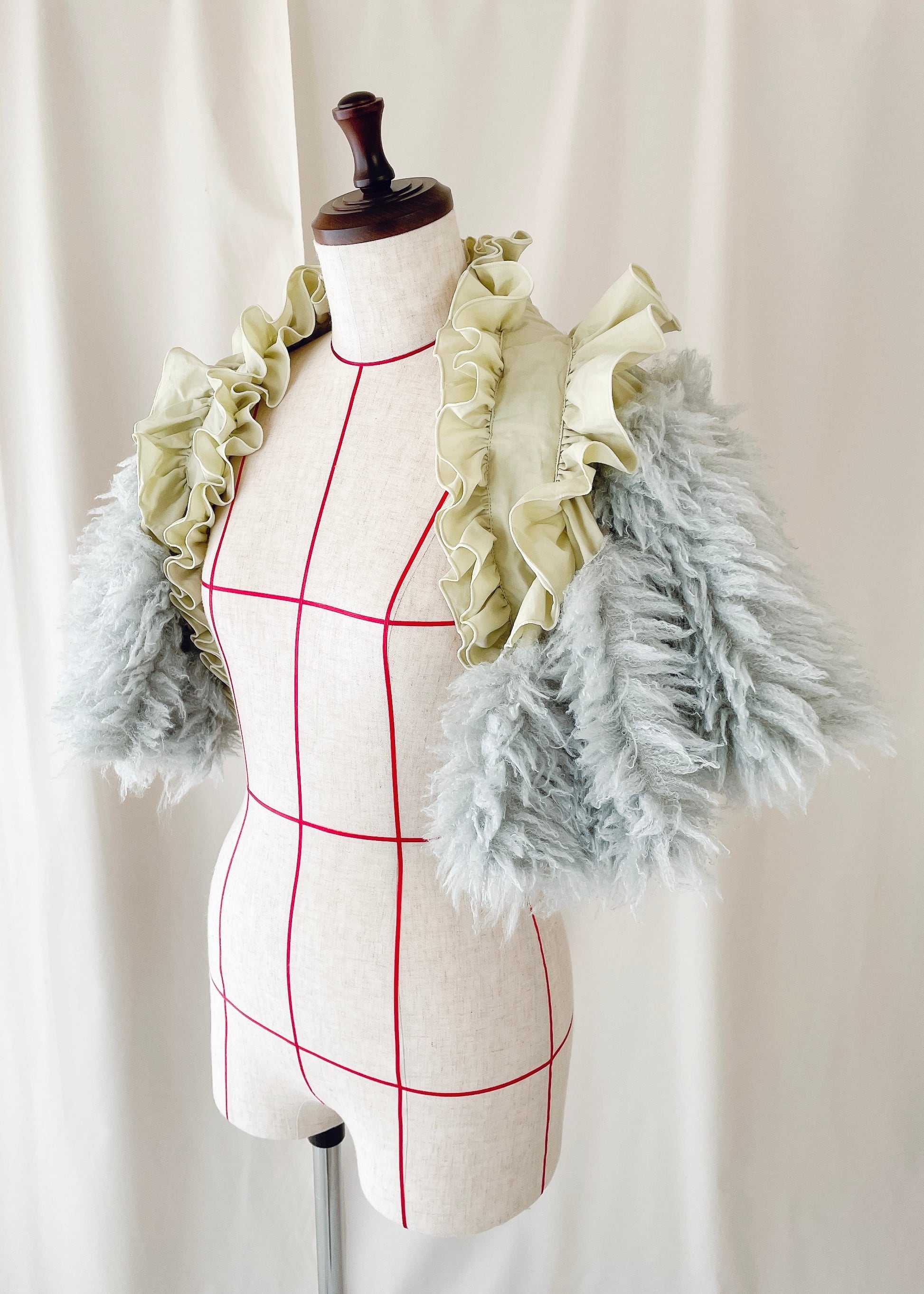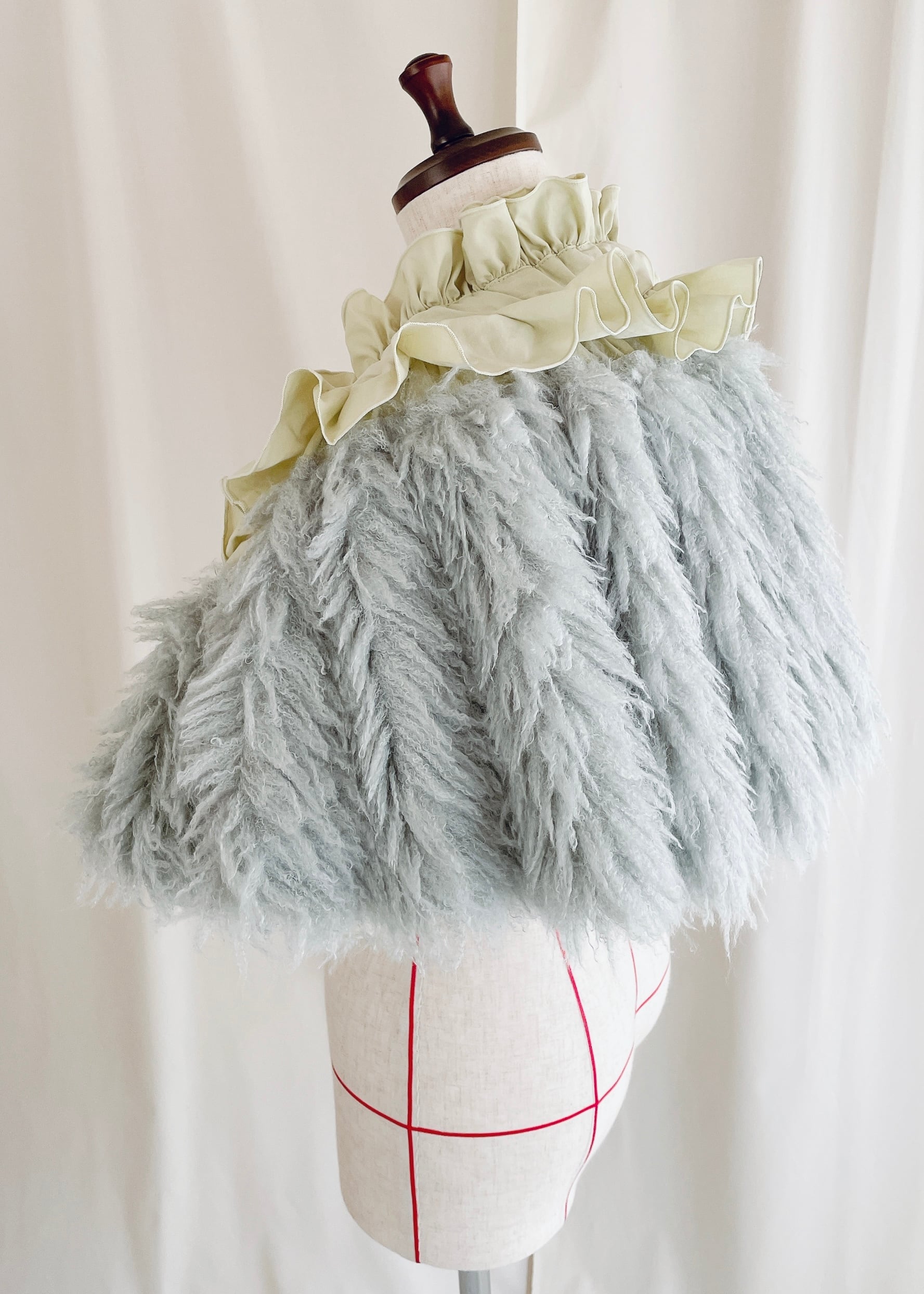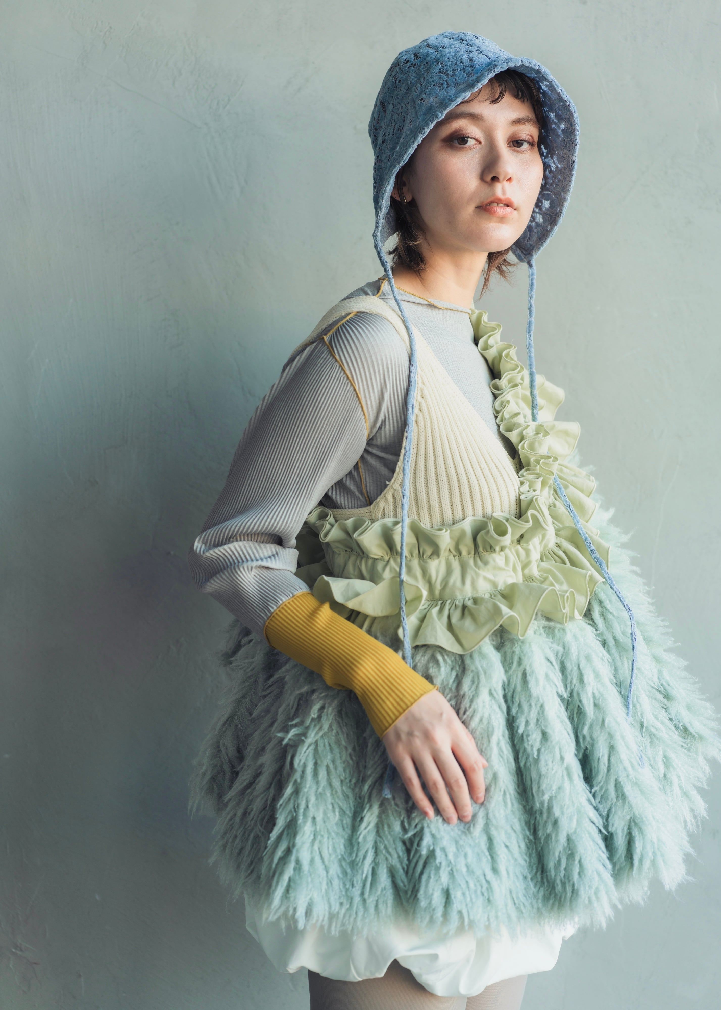 フリルには、プードル・ヴィーガンファーと高級ピマコットンを採用。