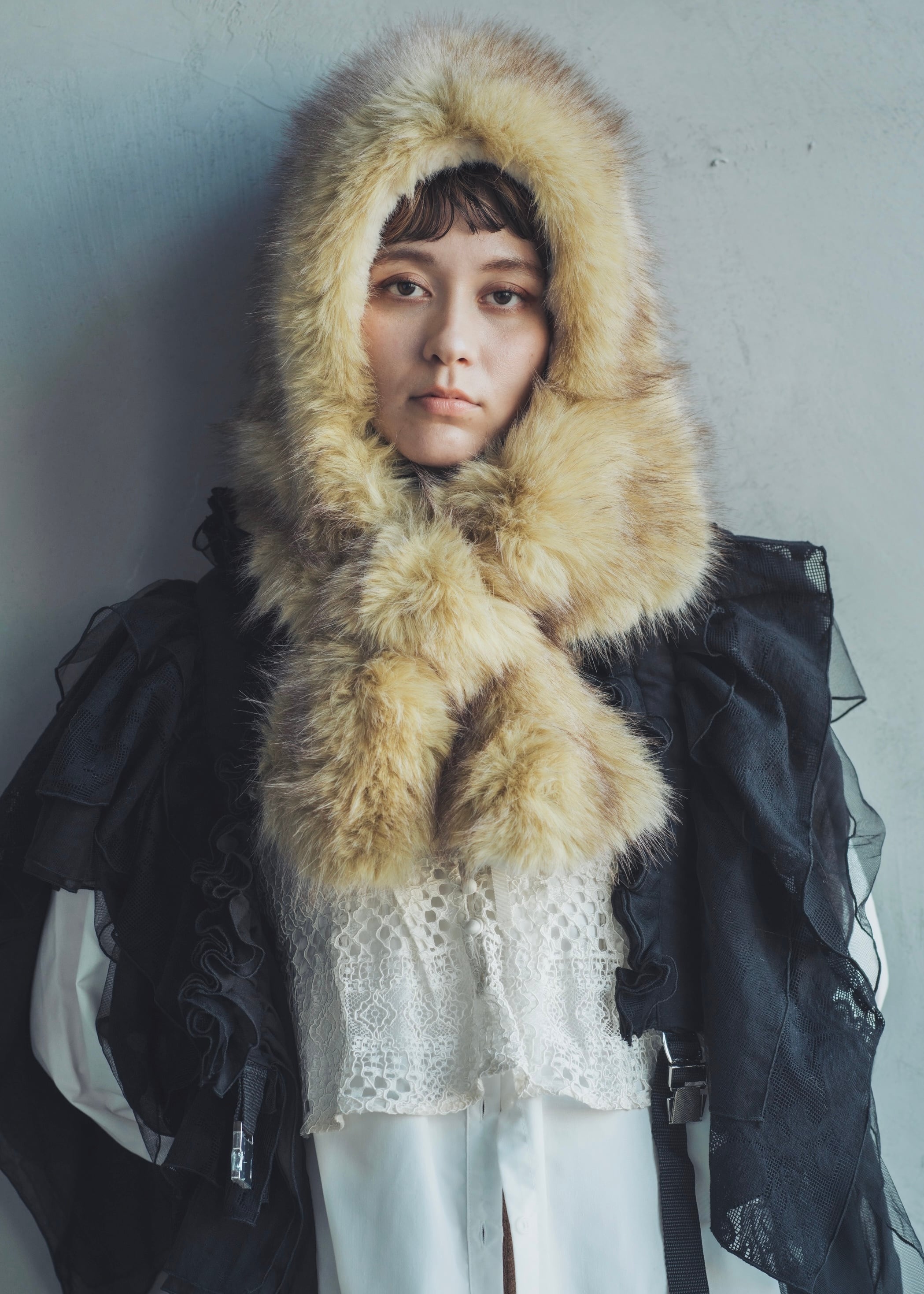 “ポフーティ” の魅力である頭巾型フード×ティペットのドッキングデザインはそのままに、ファー量をボリュームアップ。