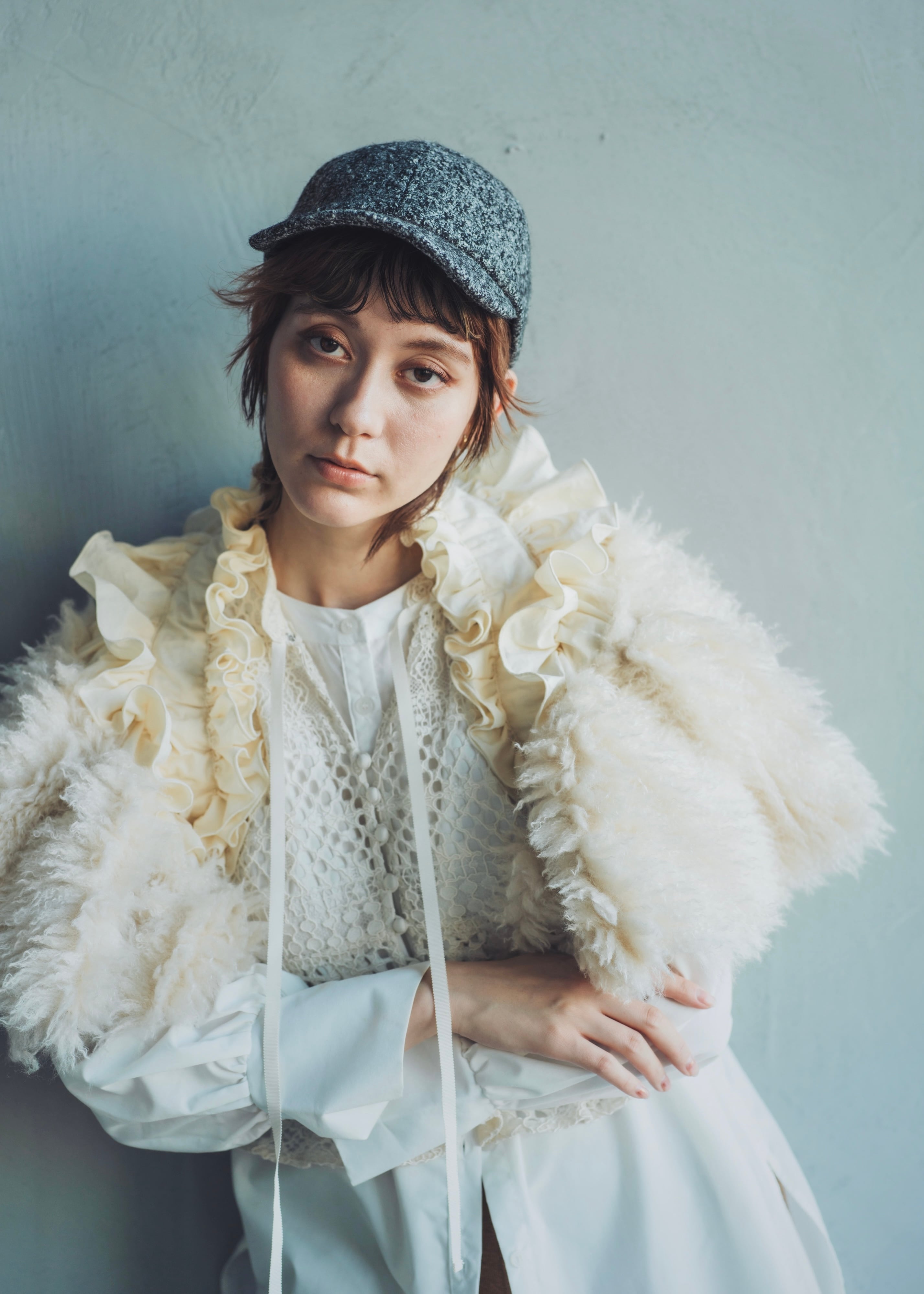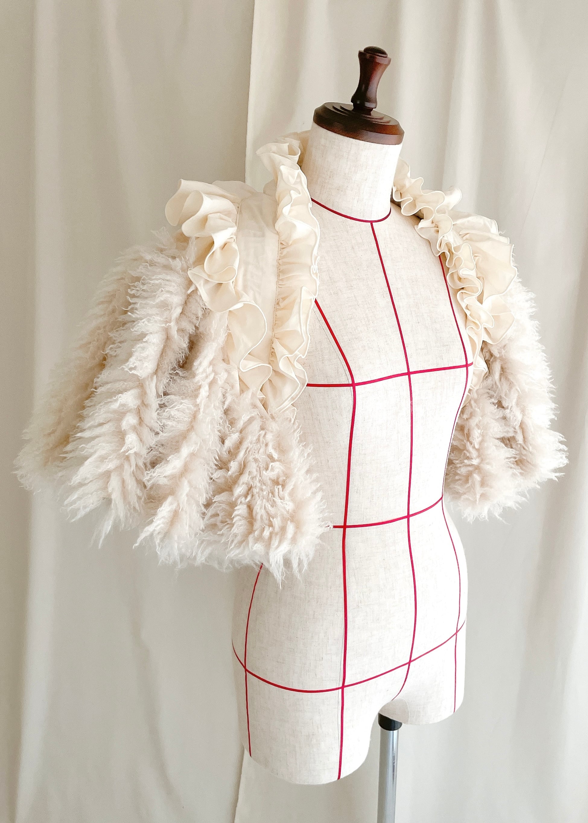 フリルには、プードル・ヴィーガンファーと高級ピマコットンを採用。