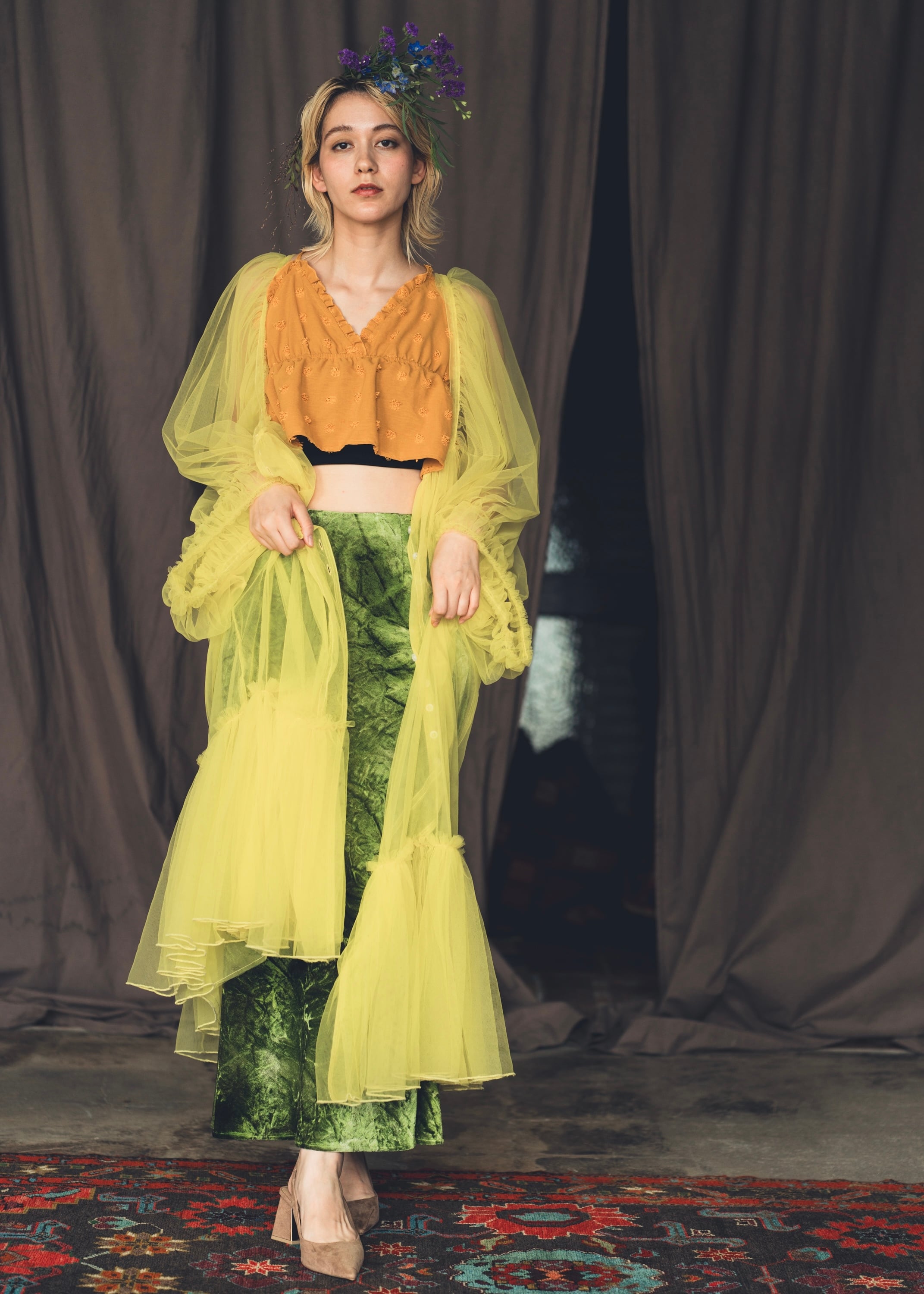 をコンセプトに、ドレスクチュールで多用されるフレアやギャザーの手法を用いつつ、日常に溶け込むカジュアルな装いに再構築したコレクションラインです。