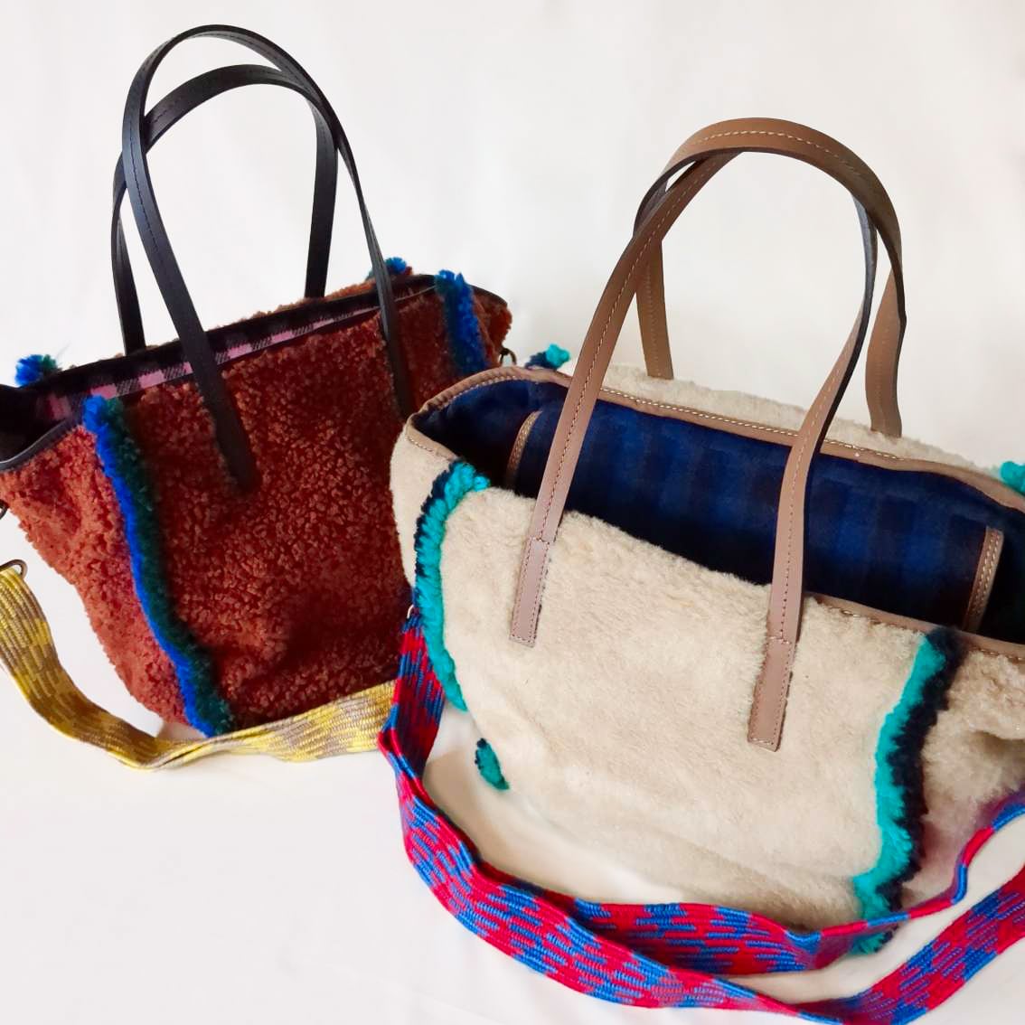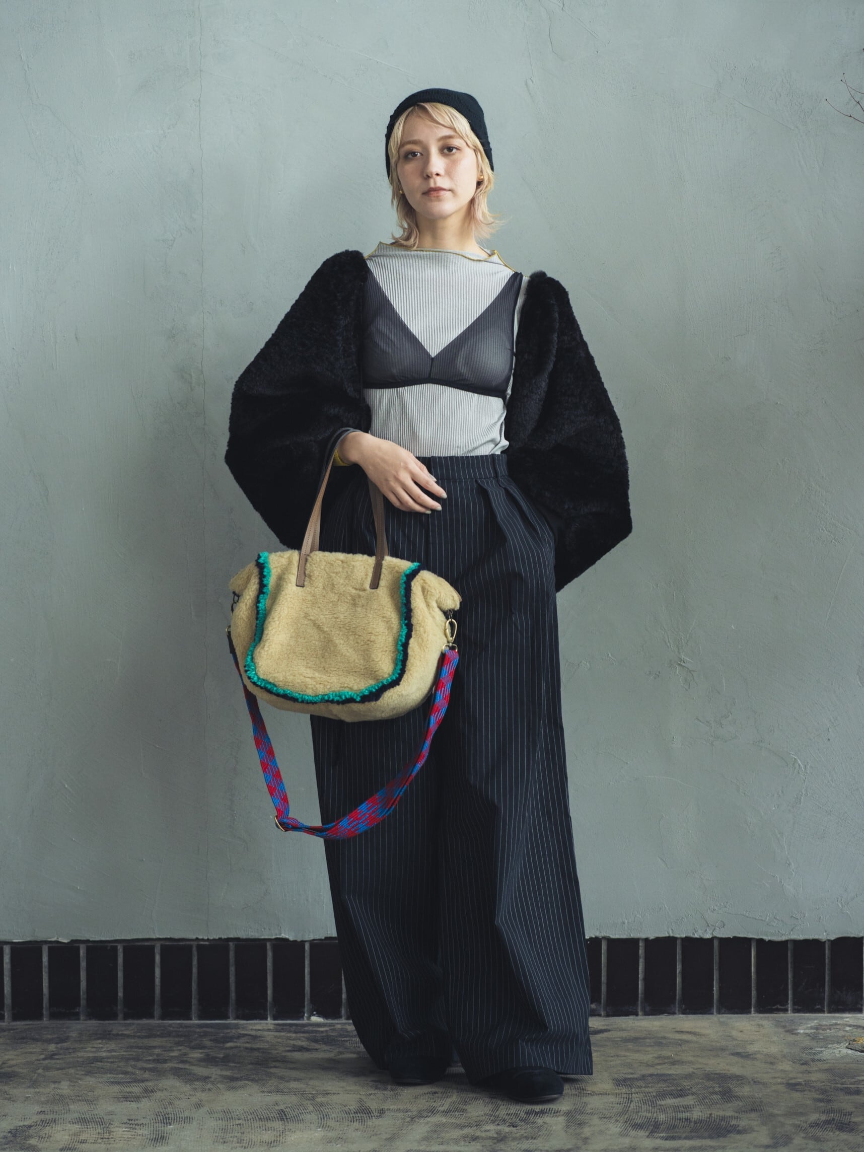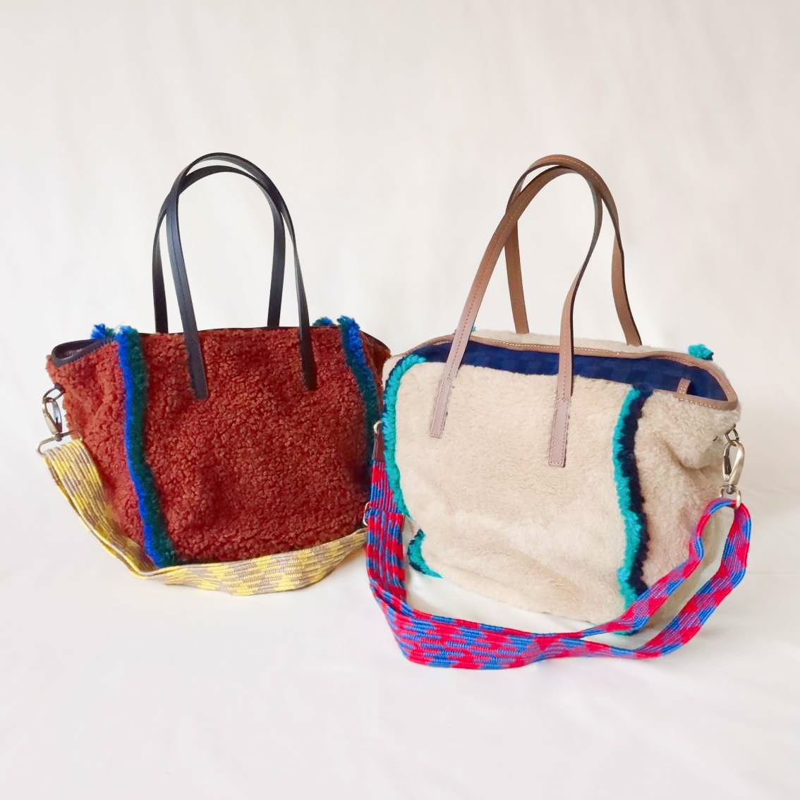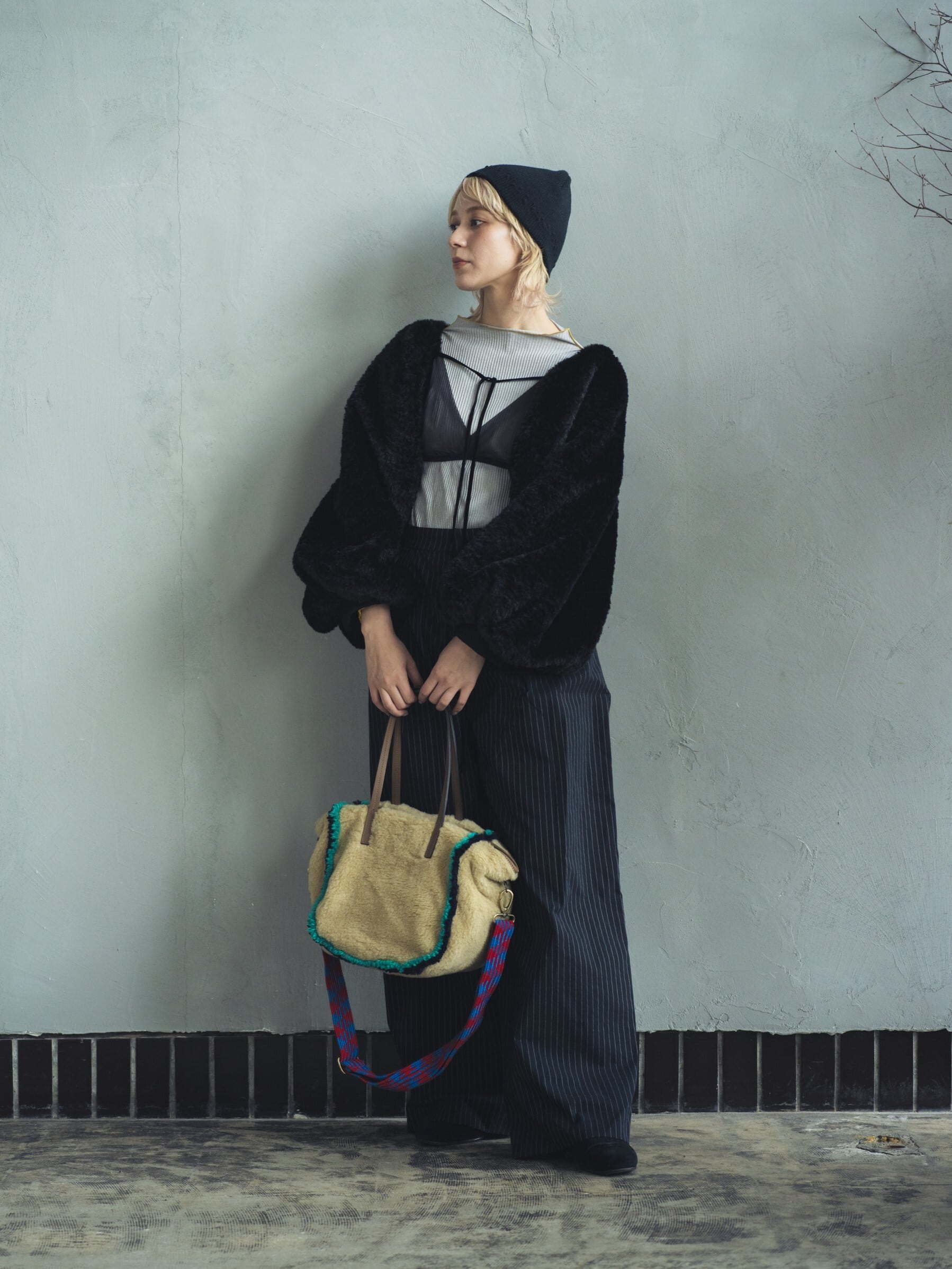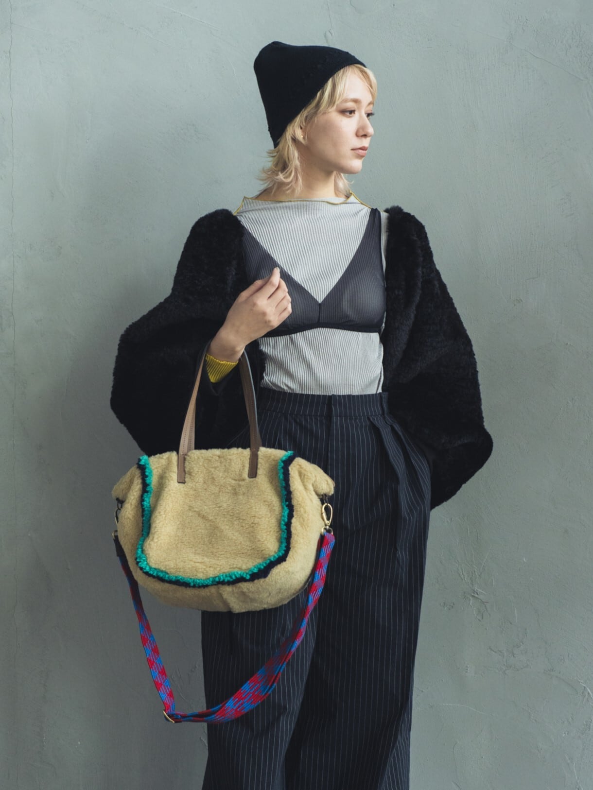 絶妙なカラーリングともこもこ感が愛らしいボアトートバッグ。
