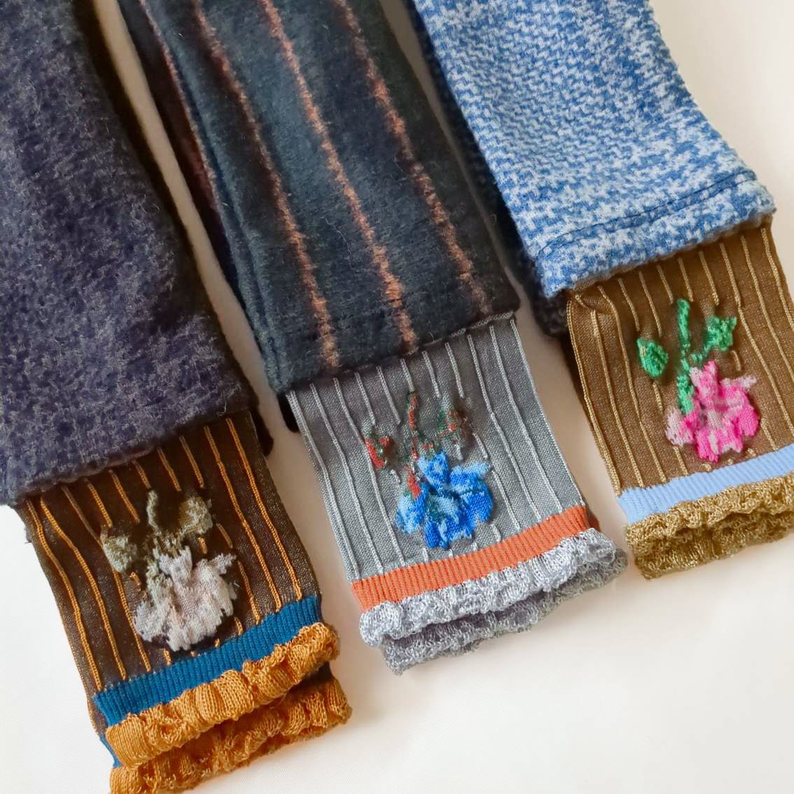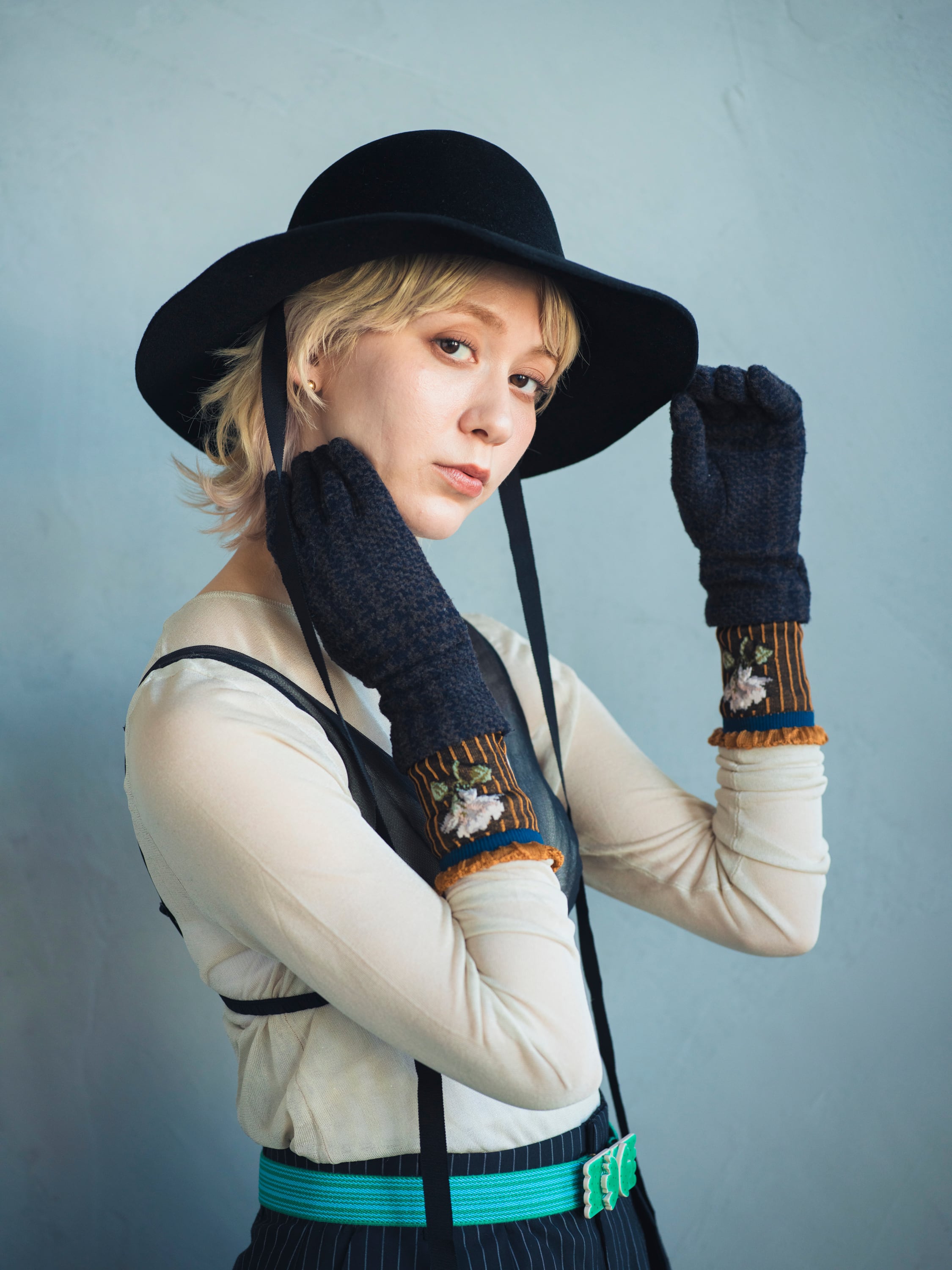 ワンポイントで編まれたフラワーモチーフがアクセントになり、冬のコーディネートに添えれば華やかな印象に。