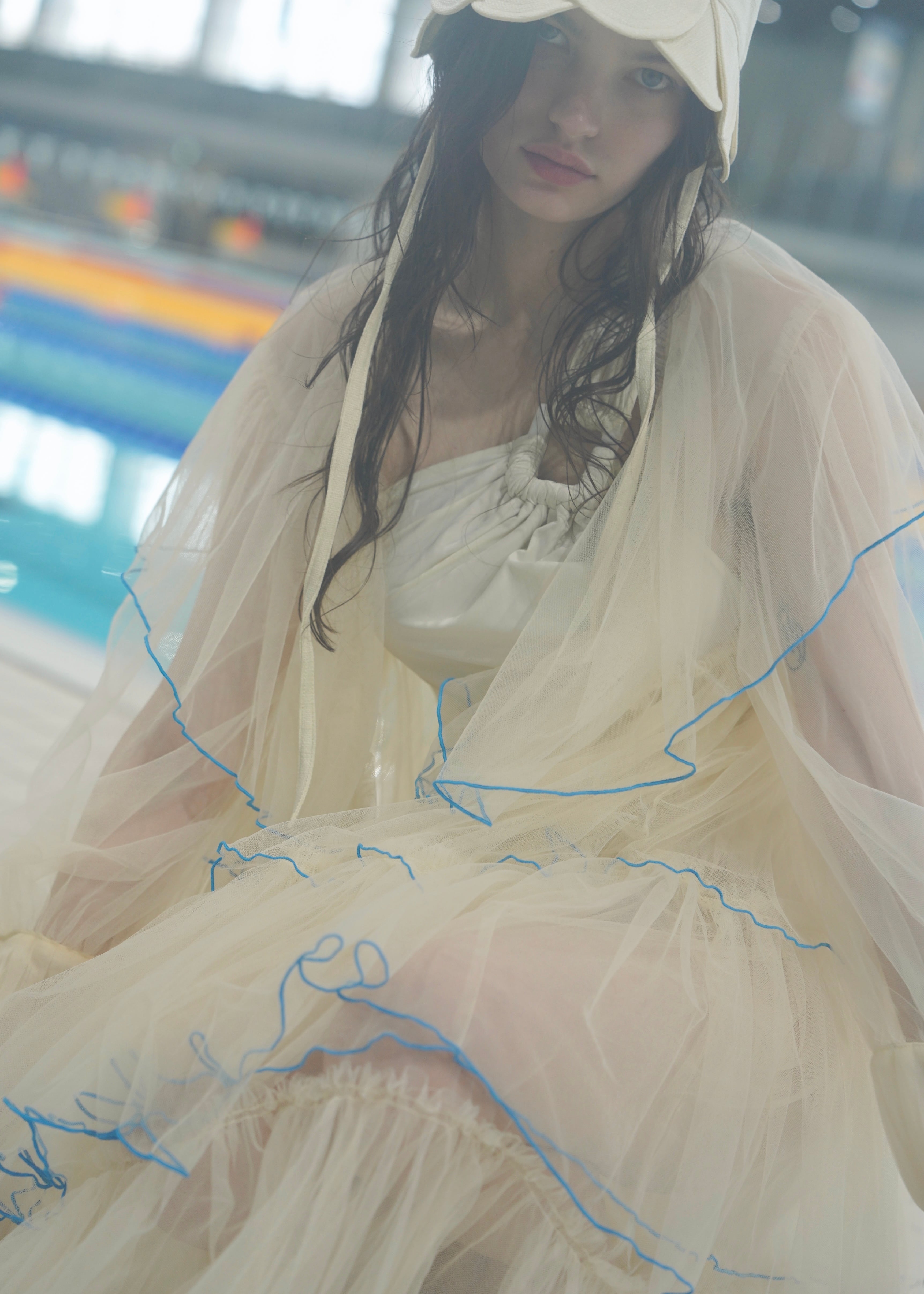 重なり合う全てのフリルの裾にはメローロック始末という丁寧でこだわりのあるディティール。